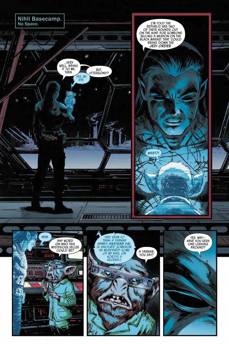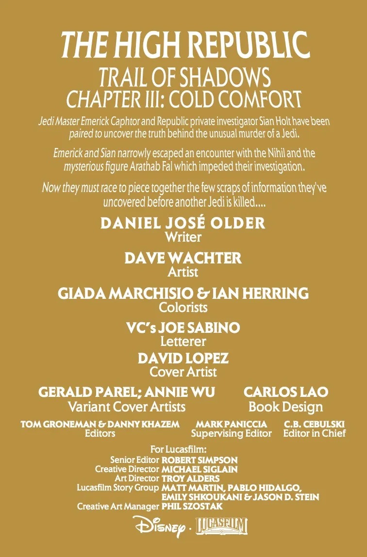 COLD COMFORT! A mysterious attack brings EMERICK and SIAN together at the Starlight to investigate connections to their case. Meanwhile, ARATHAB tries to ambush a Nihil ship with deadly results. Can Jedi Master Emerick and private eye Sian Holt uncover the clues to solve this case, or are they about to face their deadly demise at the hands of Nihil?