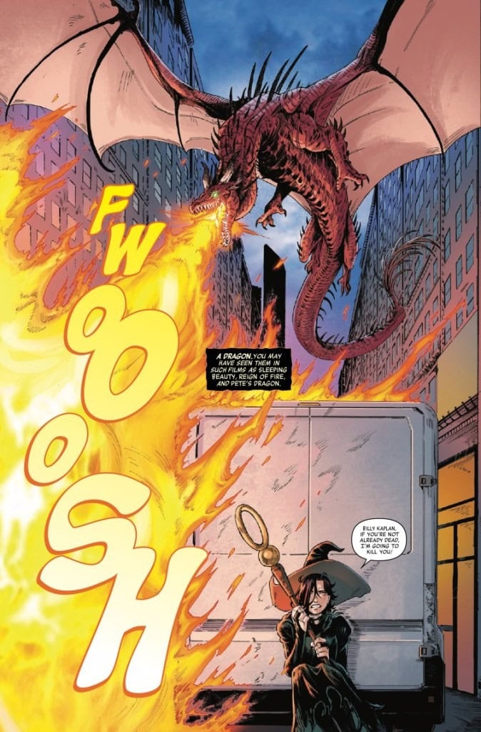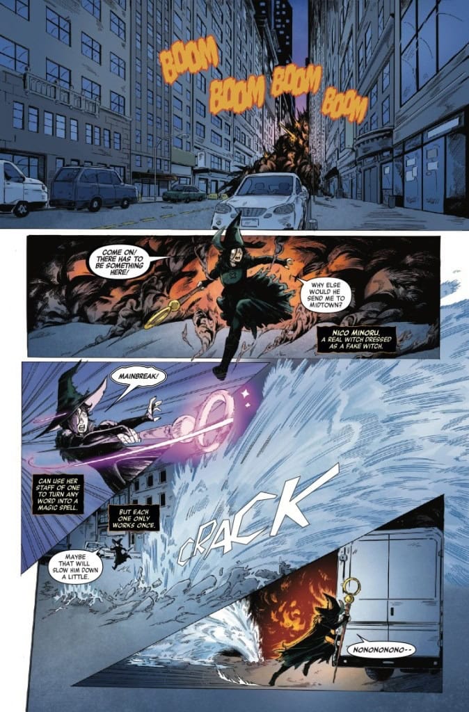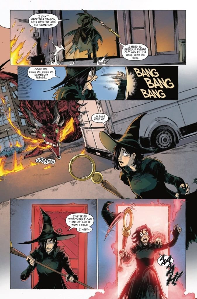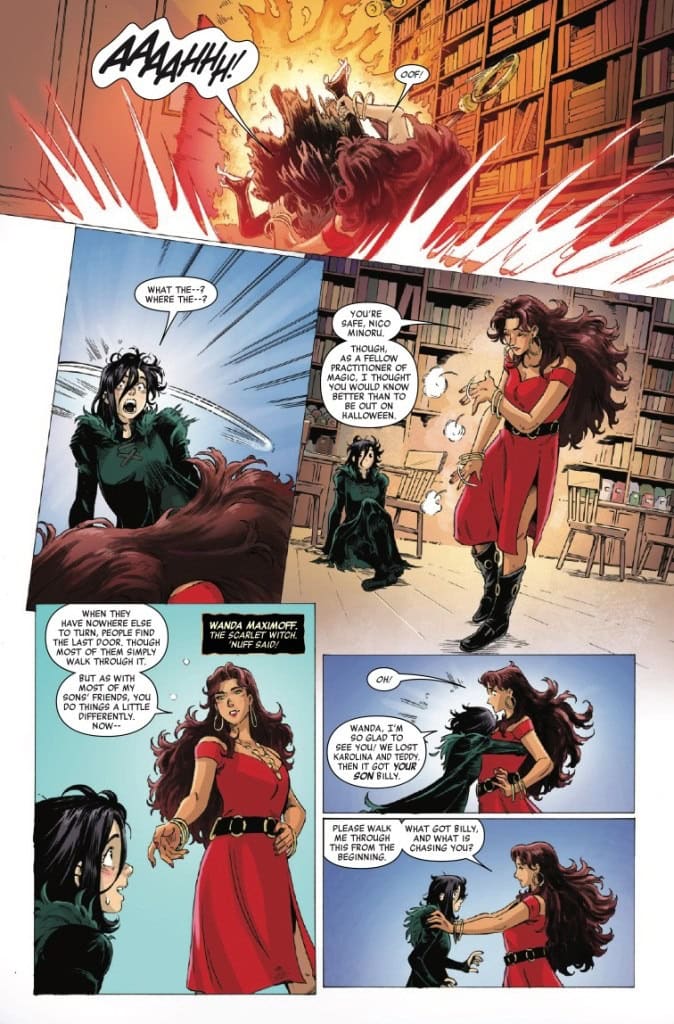 ROLL THE DICE… IF YOU DARE! It’s Halloween, and Nico Minoru joins her girlfriend Karolina Dean, and friends Teddy Altman and Billy Kaplan for a rousing round of RPG Hoosegows and Hydras. But when a dice roll leads to goblins materializing in real life and her friends all disappearing, Nico Minoru is soon left running through NYC’s streets with a very real dragon hot on her tail. Desperate for help, she finds herself at the Scarlet Witch’s Last Door. Will these two witches find the missing heroes and piece together how this board game came to life, or will their adventure end in a critical loss?