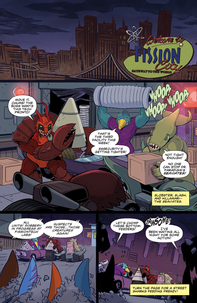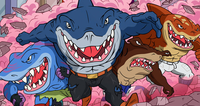 Kick some serious fin with Ripster, the great white head of the pack; Streex, the rollerblading ladies’ man (er, ladies’ SHARK); Jab, the hammerhead who loooves using his noggin; and Big Slammu, the whale shark with the whale-sized muscles, on their newest adventure! They’ll need all the help they can get to stop their arch nemesis, Dr. Piranoid, from developing… THE PERFECT PREDATOR! Little do they know, it’s already too late to stop the grossest monster they’ve ever fought from being born!
