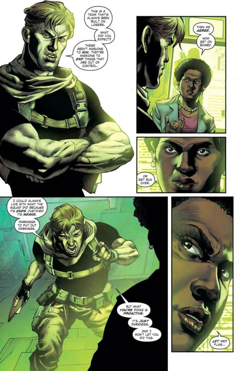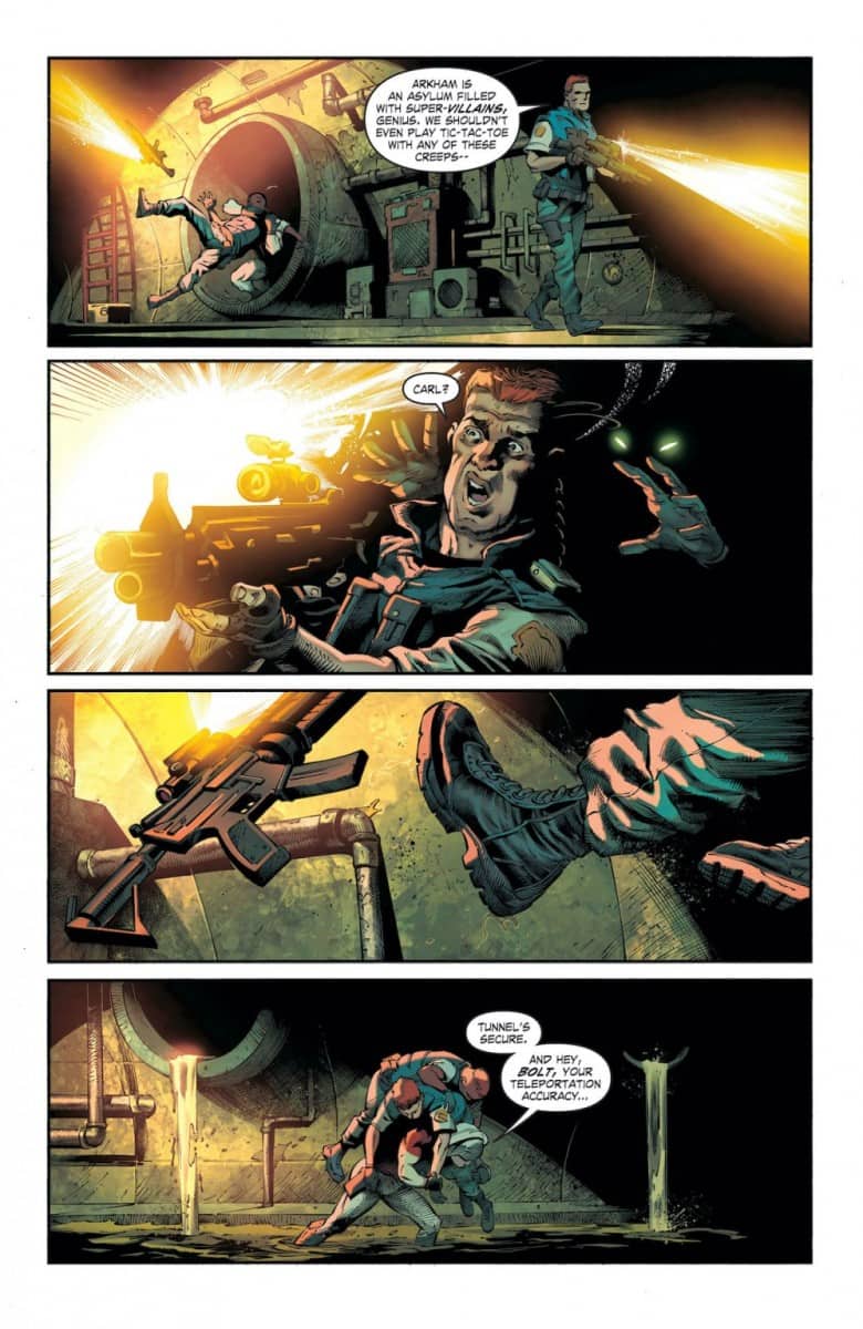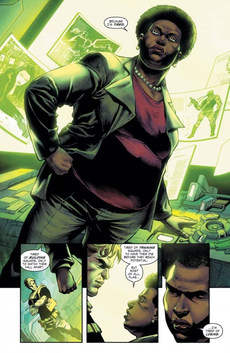 Amanda Waller—now back in control of the Squad—sends a new Squad into Arkham Asylum to “recruit” the deadly Court of Owls assassin Talon while she interviews another new candidate: Superboy.