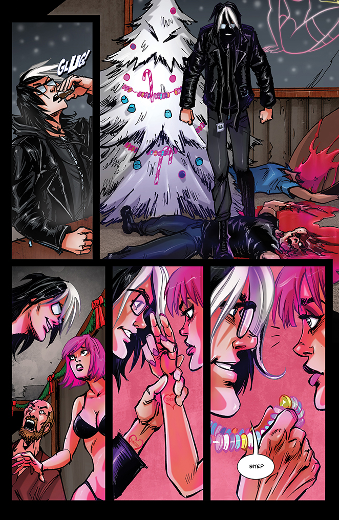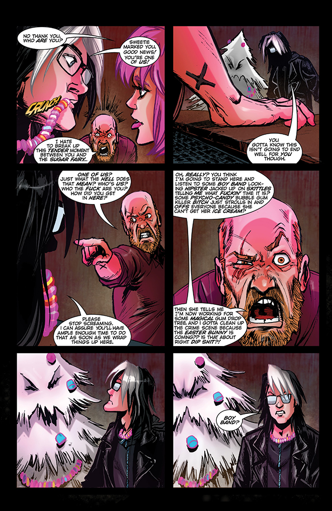 Will their rebirth marks reveal the person beneath as naughty – or nice? Is revenge sweeter than honey? Could a sweet new life await Pixie Stix, resident dancer of the once-dive bar? Now that the Ice Cream Bunny is under the newly appointed management of an enchanted Christmas tree named Tinsel, will all be merry and bright? Exactly who and what is Sweetie, and what is her mission? Treat yourself to a heaping spoonful of sugar and watch it all go down in the most de-frightful way in SWEETIE CANDY VIGILANTE #2: “Run this Town.”