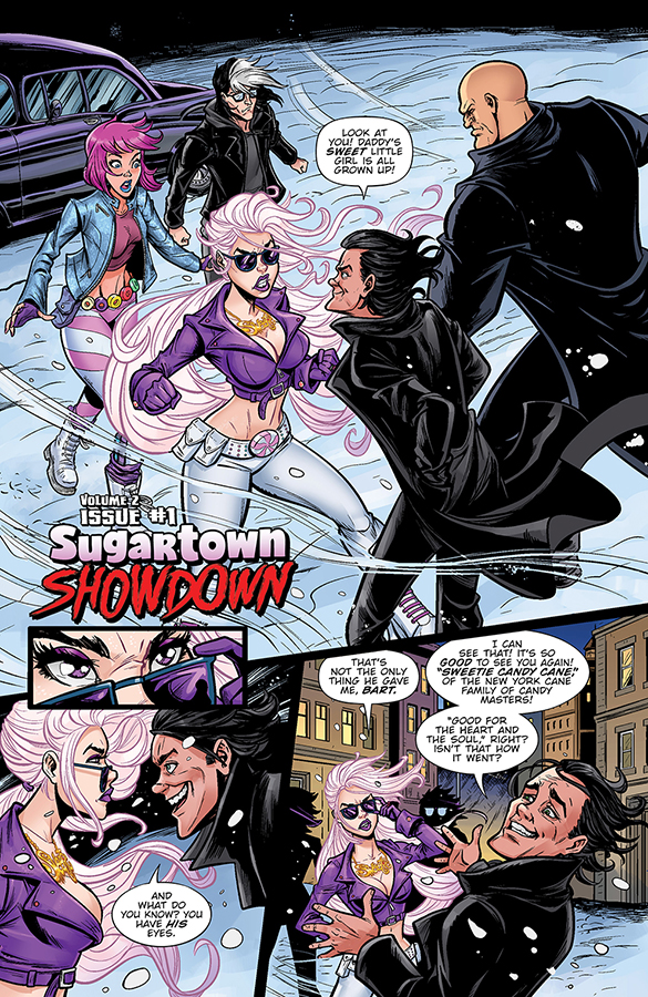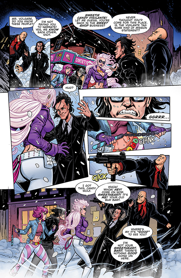 Sweetie and her Candy Vigilante squad are back to kick off Volume Two of their SWEET new series with the epic, not-to-be-missed “Sugartown Showdown!” Together with her shape-shifting, licorice-loving lycanthrope Candy Wolf and newly “minted” ninjette warrior Pixie Stix, Sweetie faces off against her “salty” arch-nemesis Bart Volgare and his gang of thugs in the icy, snowy streets of New York City with a violently delicious fury.
