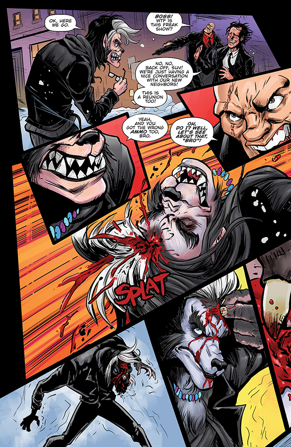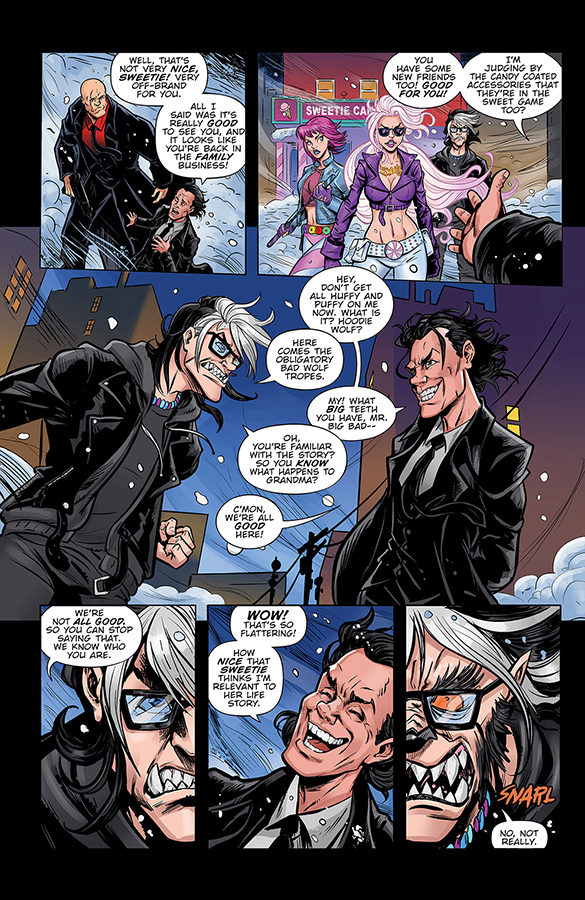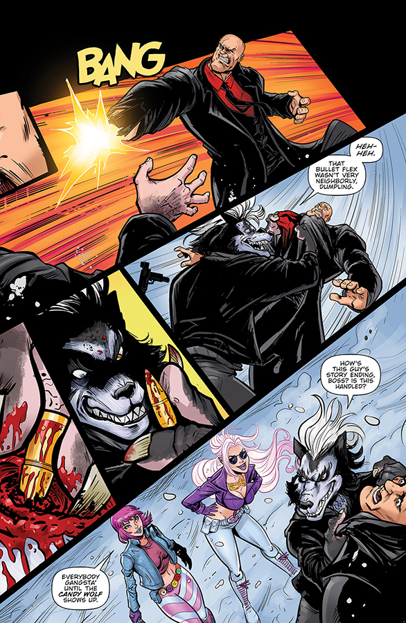 So, you have chosen salt? So be it! Blood is spilled and lives are changed (including many ended) as an army of fabled supernaturals and sugar-fueled allies hop into action to scramble the bad eggs. Candy Wolf shows the crime syndicate soldiers what big teeth he has, while Pixie gives her newly gifted nunchucks a maiden battlefield test-spin, reducing criminal weaponry to molten scrap metal! Sweetie’s signature Jawbreaker gun also resurfaces, armed with delicious new ammo (can’t you just smell the gingerbread?), but not before she unleashes some brand-new, sweetly sinister confections that wash away the naughty and leave a wicked smile on your face — literally! Isn’t that NICE?