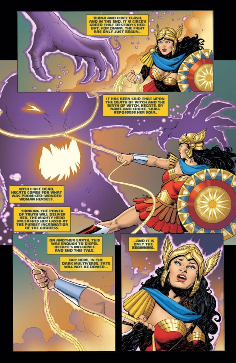 The realms of the gods have been turned upside down and inside out, on the verge of engulfing Earth and its people. Only one hero stands to defend it: Wonder Woman! But that is another world and another story. Behold the mirror image of this tale taking place in the Dark Multiverse, with a Wonder Woman who is ready to destroy it all! Cursed by the evil goddess of magic, Hecate, our beloved Diana has become a weapon of vengeance ready to tear down any god or superhero that stands in her way. Will Earth and its heroes survive her might? Or are they doomed to worship the dark princess of the Amazons for the rest of eternity?!