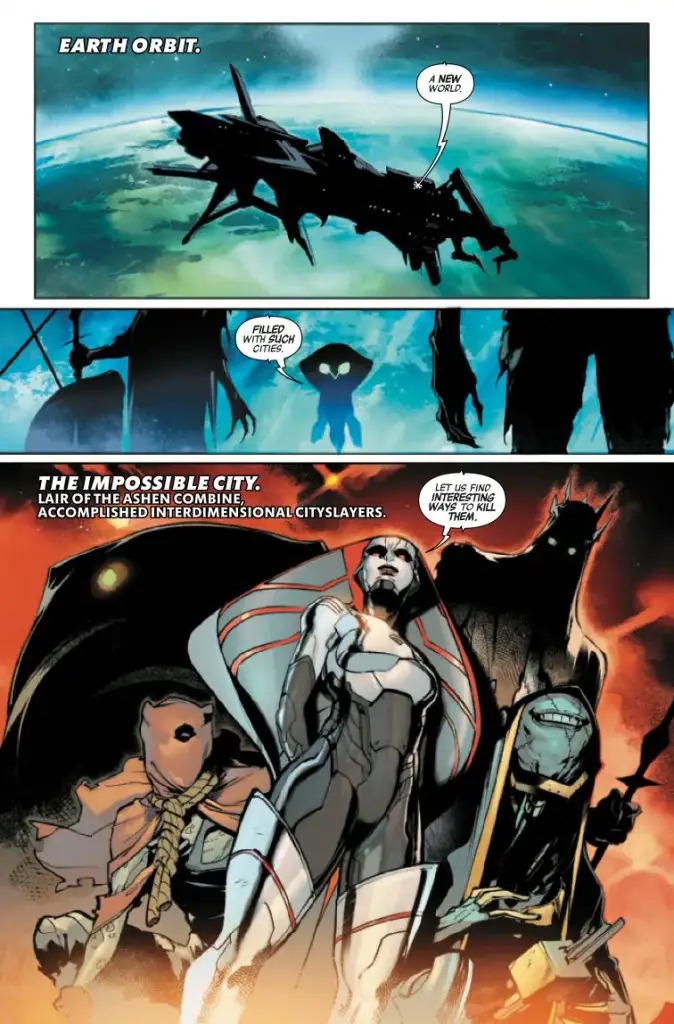 The first Tribulation Event strikes the Earth! The Avengers fly into action as the Ashen Combine—a collection of the Multiverse’s greatest monsters—descends from the Impossible City to follow their respective appetites. Cityslayers all, pursuing the assassination of metropolitan areas for sport!
