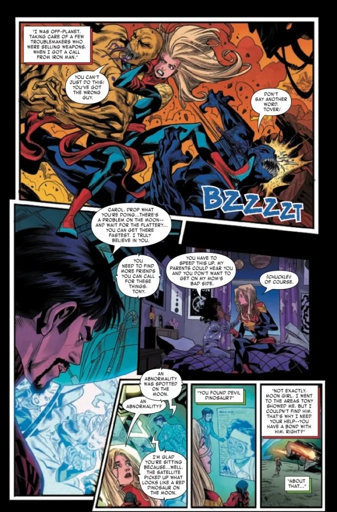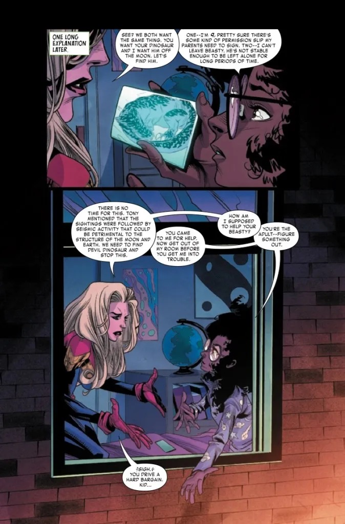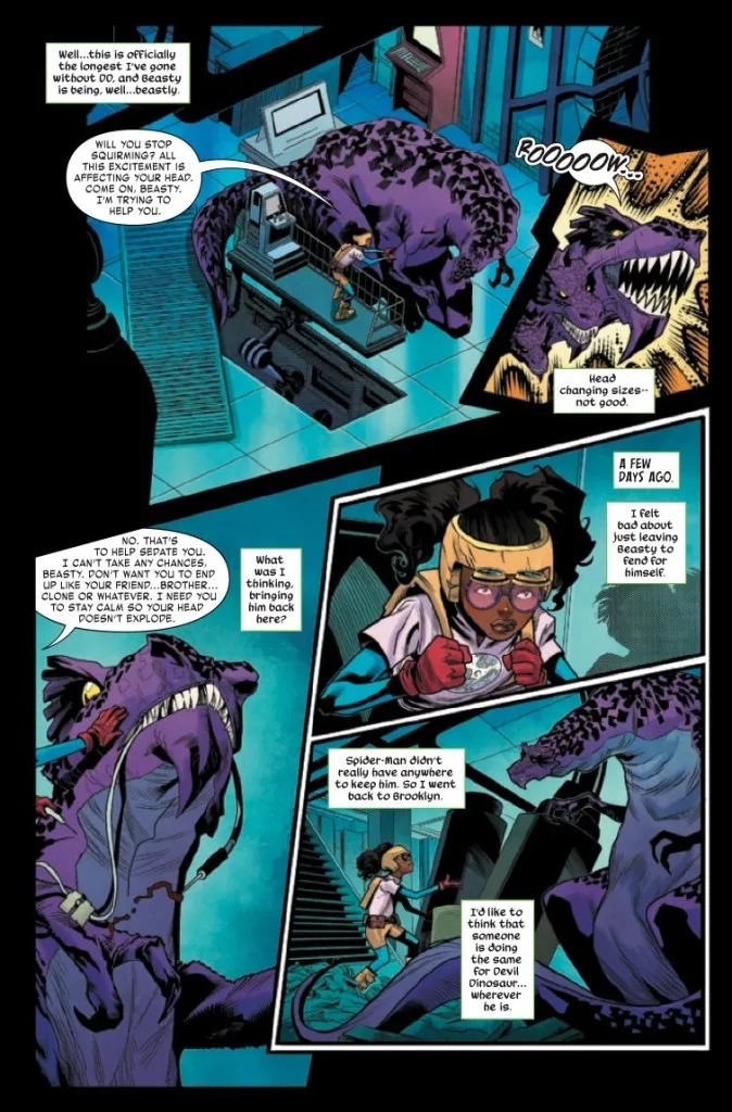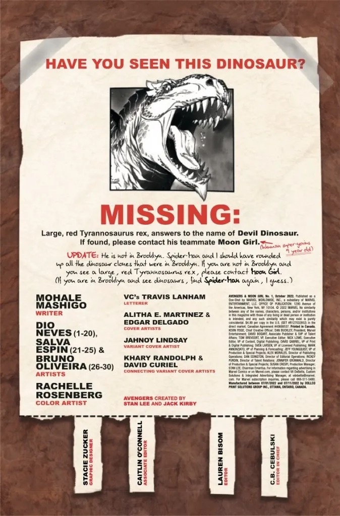 Even after a team-up with Miles Morales to scout Brooklyn for her missing T-Rex, Moon Girl is still missing Devil Dinosaur. and now she has a wonky DD clone to try and stabilize for fear of explosive repercussions. But the Avengers have found some rogue dinosaur activity and need her to come with them right away to fix it—from Wakanda to the moon!