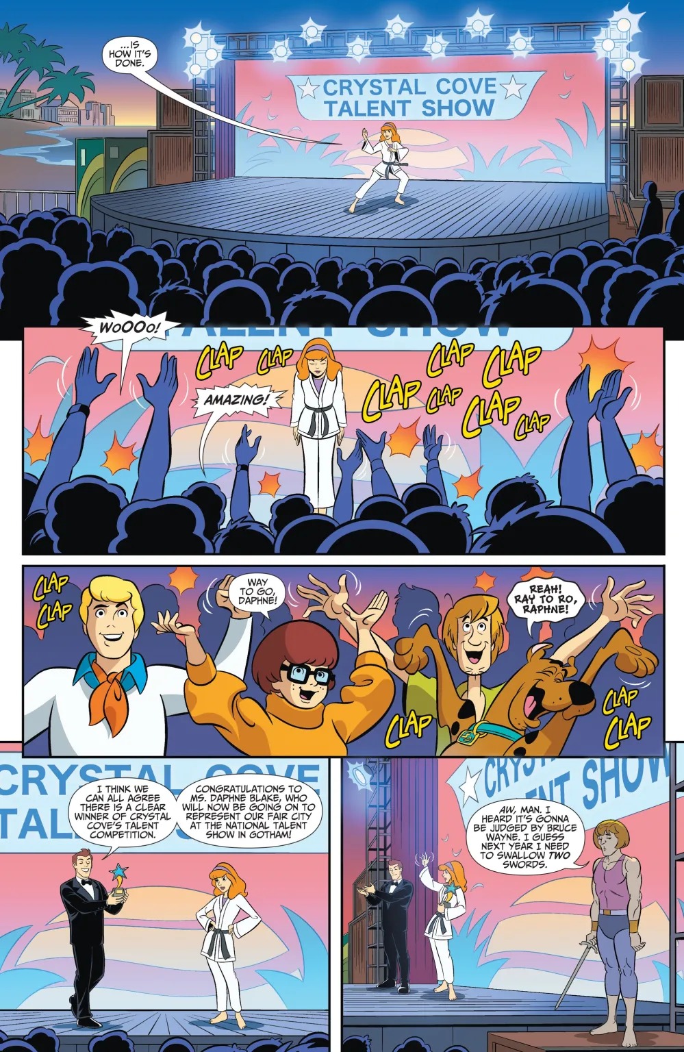 Daphne’s martial arts hobby takes center stage at a national competition: Gotham’s Got Talent! It’s all good until her competitors start being talent-napped. Judge Bruce Wayne calls in Batman, who teams up with Mystery Inc. to infiltrate the competition. Can they solve the mystery before front-runner Daphne winds up in real trouble?