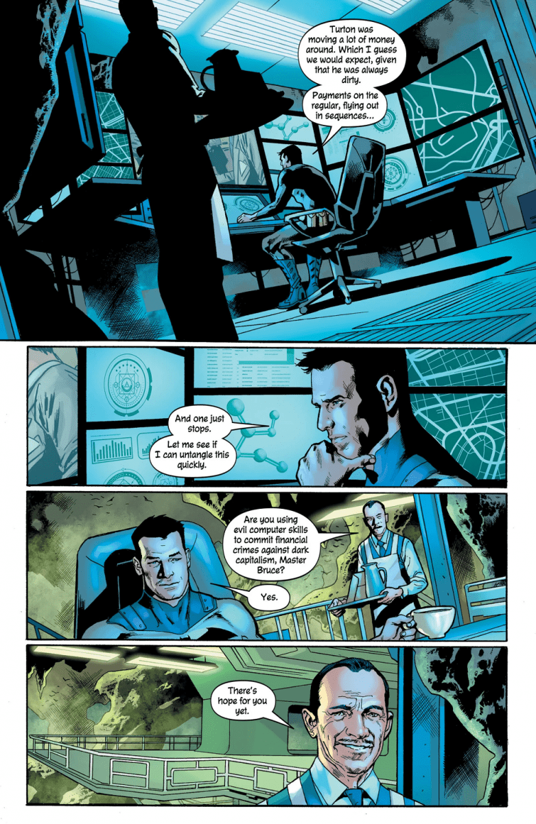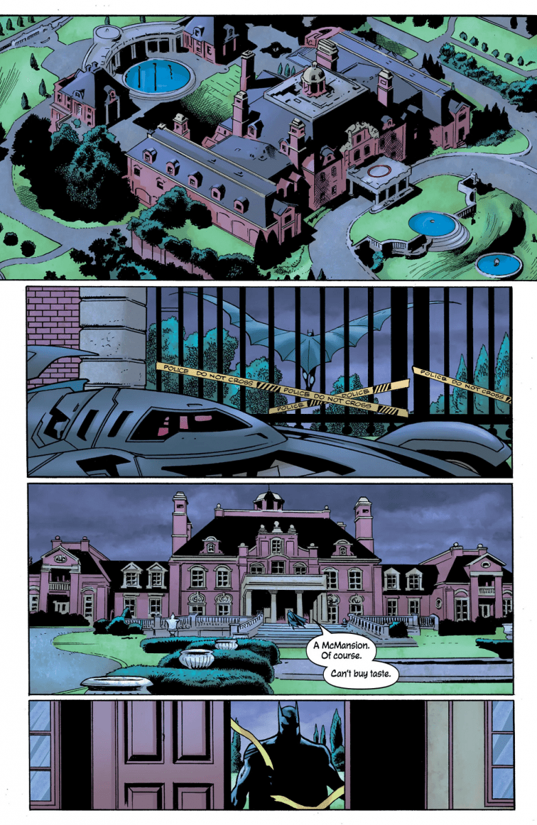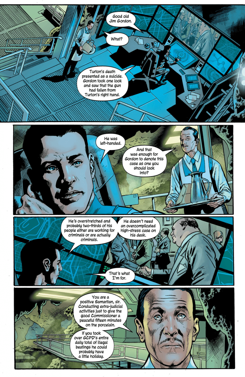 A corrupt politico dies by his own hand, but James Gordon is convinced there’s something more to it. Now, it’s time to ask for access to the Batman’s resources. And that is why, right now, in a stately Gotham City mansion, the Batman is being beaten to death.