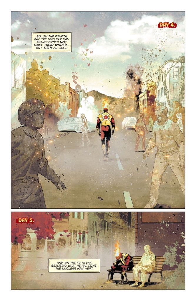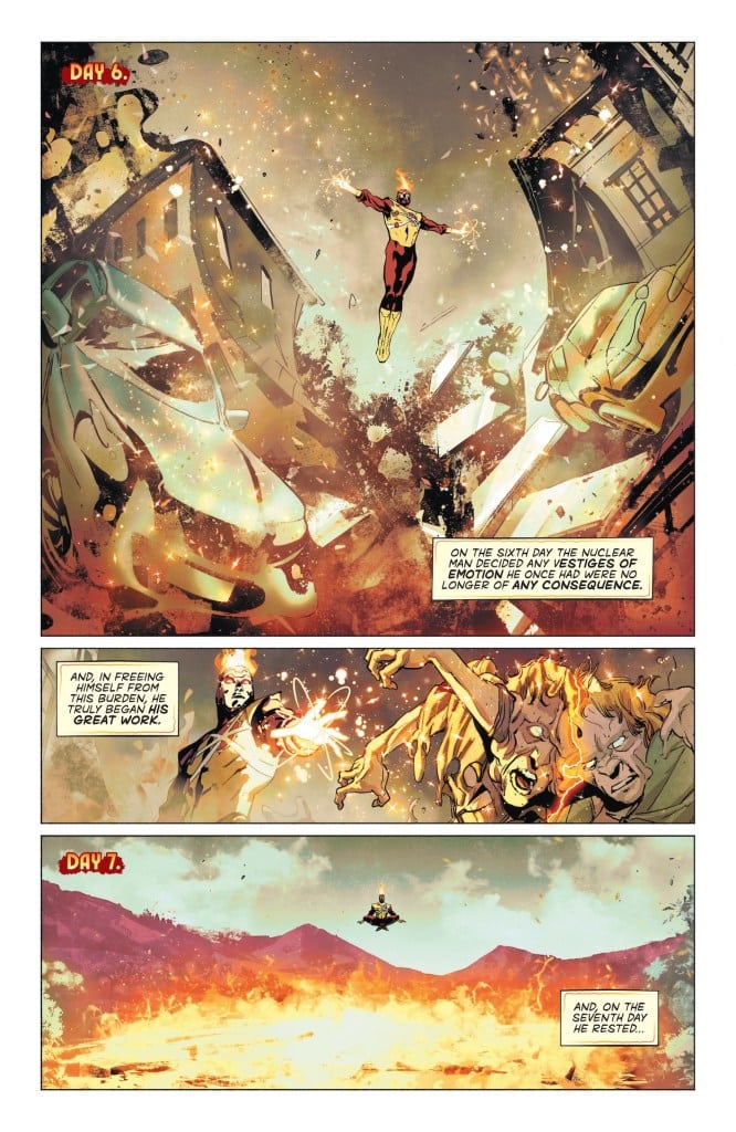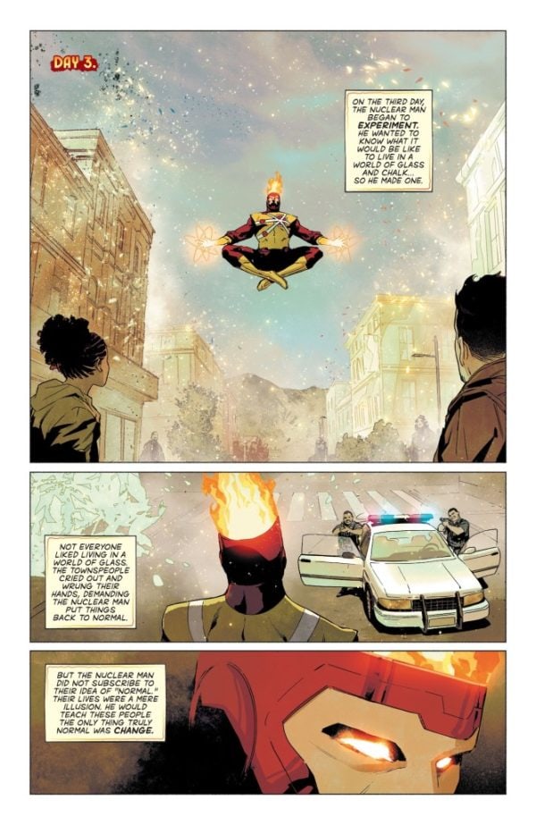 The community of Bedford, Colorado, is a sleepy small town. The people say hello to their neighbors, attend town hall meetings, and root for the local high school football team on Friday nights. But this idyllic small town is thrown upside down when the Nuclear Man arrives and starts… experimenting. Firestorm has turned buildings to sand and people to glass with no remorse and no warning. But what exactly provoked Ronnie Raymond to commit this heinous act, and can anyone contain the fury that is Firestorm?