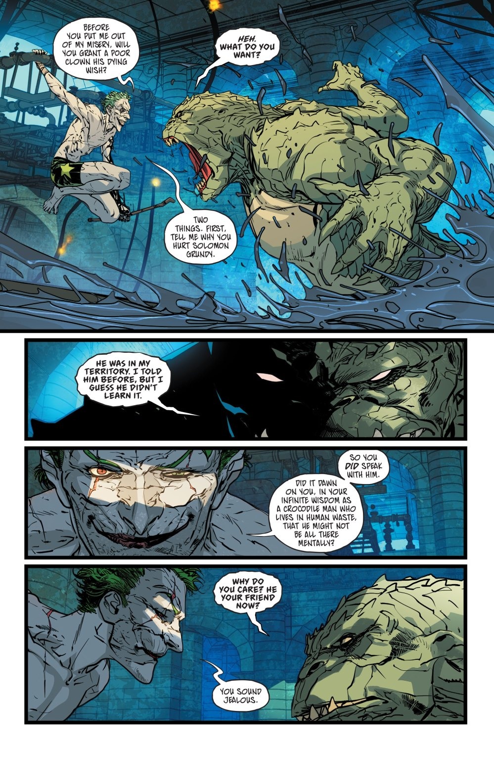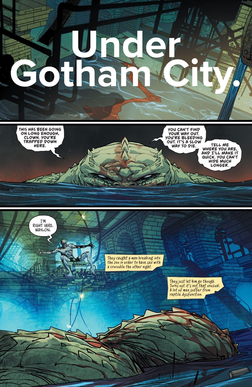 What’s big and scary and lives in the sewers? In Gotham City, a lot of things. But the Joker is going to war with the biggest scariest of them all—Killer Croc! Plus, Red Hood is being set up to take a fall at Blackgate Prison…and his only hope of survival may just be someone from his past.