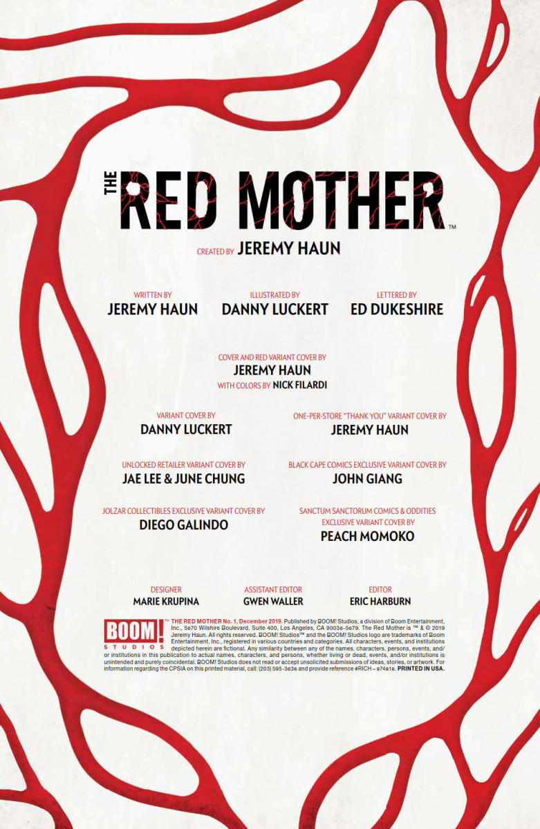 Boom! Studios launches the new psychological horror series The Red Mother from Jeremy Haun (The Beauty) and Danny Luckert (Regression) this Wednesday, and we’ve got a preview of the first issue for you here; check it out…