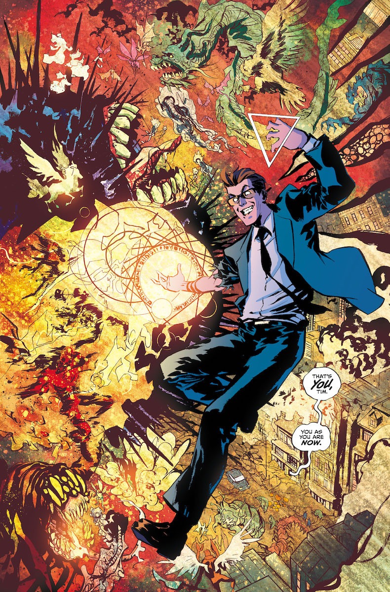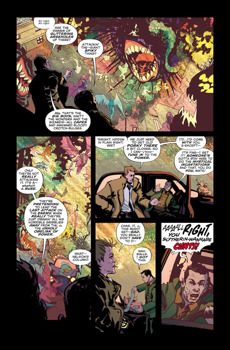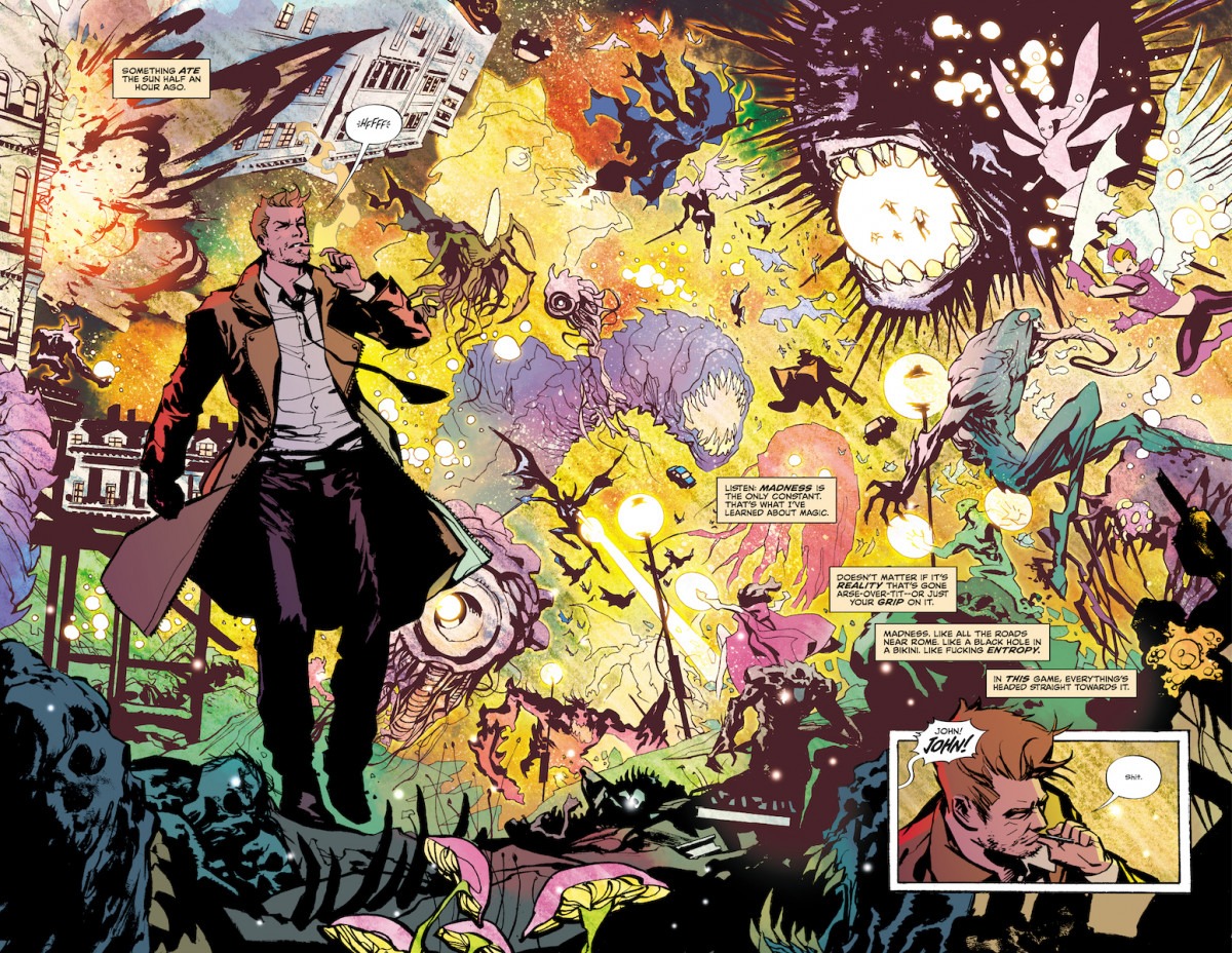 Constantine is seen in an expanded version of a critical scene from Neil Gaiman’s classic Books Of Magic miniseries. After getting tangled up in a magical war waged across countless futures, Constantine was murdered by an all-powerful adversary: a twisted version of the promising young magician Timothy Hunter, bloated with evil. But over the past year strange forces have conspired to restart Tim Hunter’s tale, and somehow—amid sorcery, insanity and secret agendas—this older, wiser, wilier shade of Constantine has been dragged back with it. Now he must ask himself why he, the last person in the world to deserve a second chance, has been given one. Is John Constantine here to put Tim Hunter on the right track and avert a terrible outcome? Or is it because he’s the only person in existence with the guts to do what really must be done? After all, he’s a nasty piece of work, chief…ask anybody.