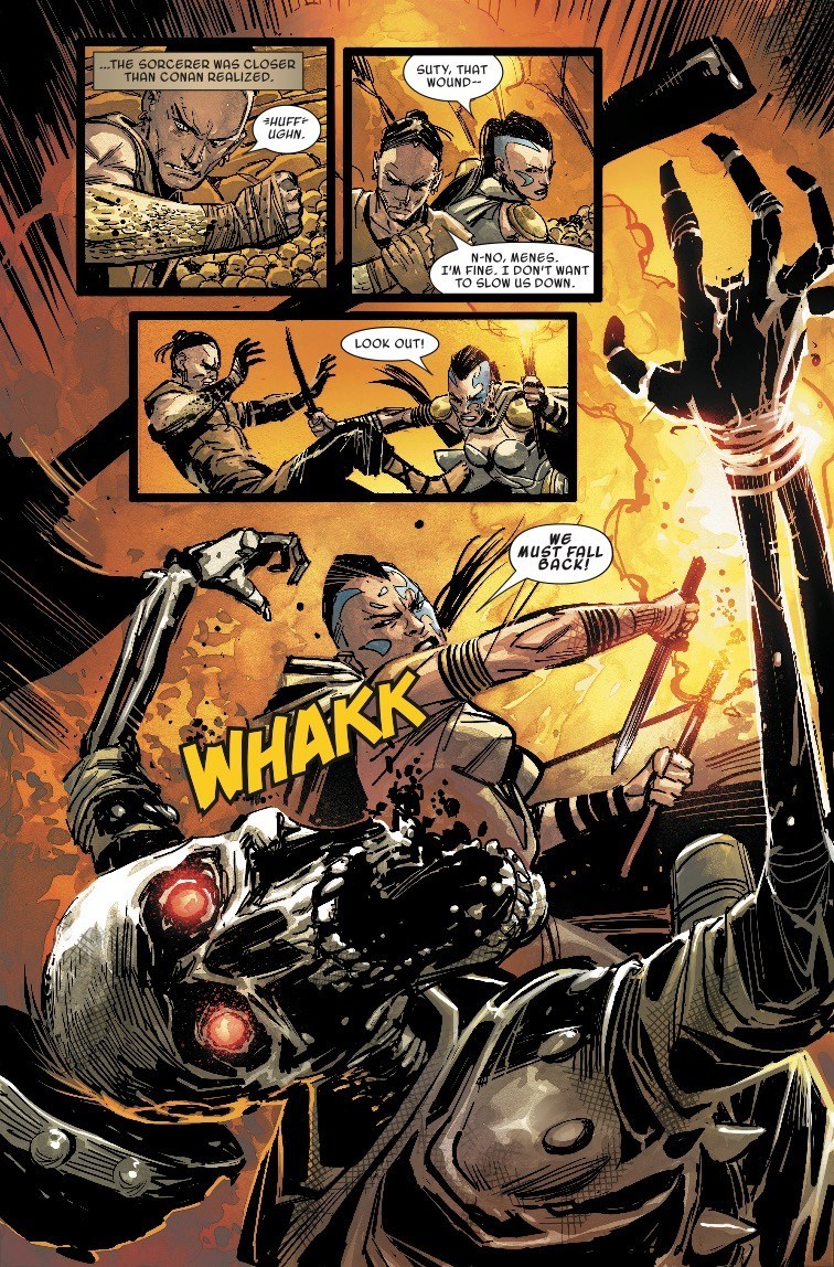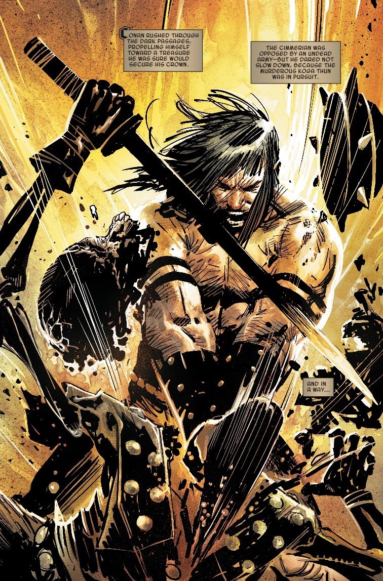 CONAN descends into a hidden labyrinth protected by an undead army and does battle with the forces of KOGA THUN! At stake – the fate of Stygia! Conan’s friend SUTY begins a shocking transformation as he discovers what MENES has been hiding about the mysterious treasure they’ve been hunting… PLUS: The next chapter in the all-new CONAN novella “THE SHADOW OF VENGEANCE”, begun in issue #1 of SAVAGE SWORD!