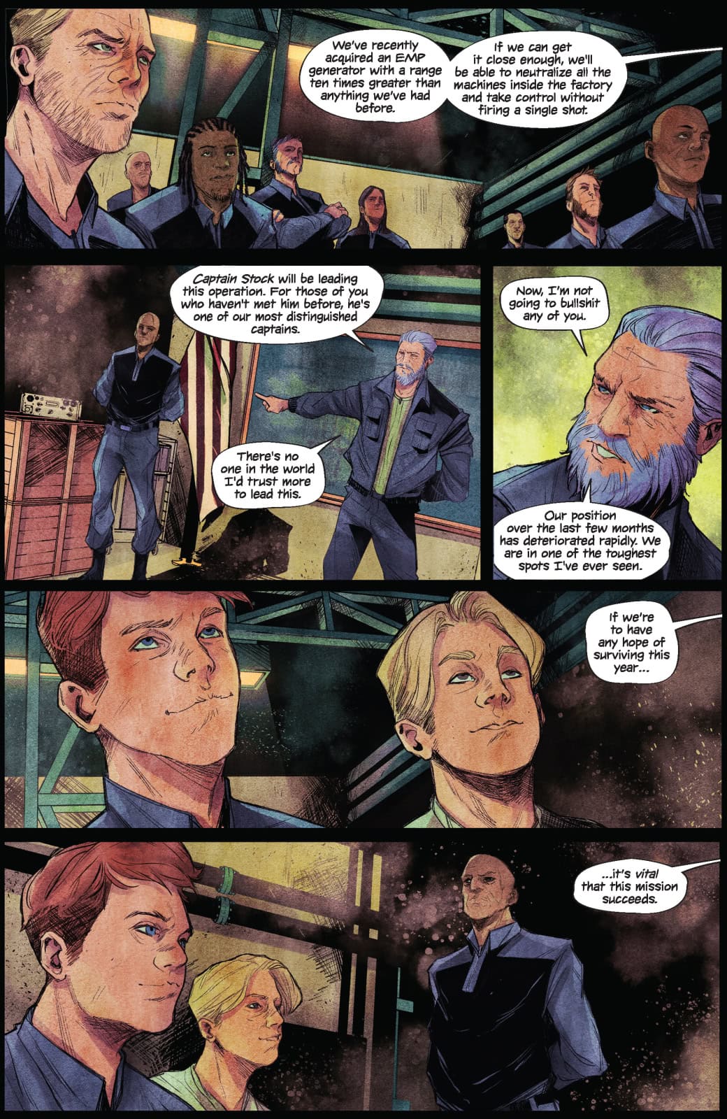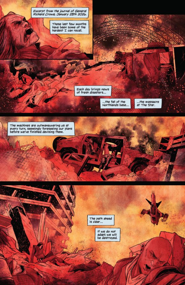MISSION CREEP! The survivors of Judgement Day have fought heroically against Skynet’s untiring cybernetic killers, but fragile biology is inexorably giving way to implacable metal. If humanity is going to have any chance of achieving victory, the Resistance must start acting — and thinking — more like its enemy. But will the ruthlessly efficient tactics of the machines succeed in the hands of flesh-and-blood fighters? And if so, what will it end up costing them? Discover the top-secret answers in The Terminator: Metal #4, intercepted by intelligence officers DECLAN SHALVEY and RORY MCCONVILLE and expertly decoded by GIONA ZEFIRO — featuring additional image analysis by SHALVEY, BOB LAYTON, SEBASTIAN PIRIZ, and EMANUELE ERCOLANI!
