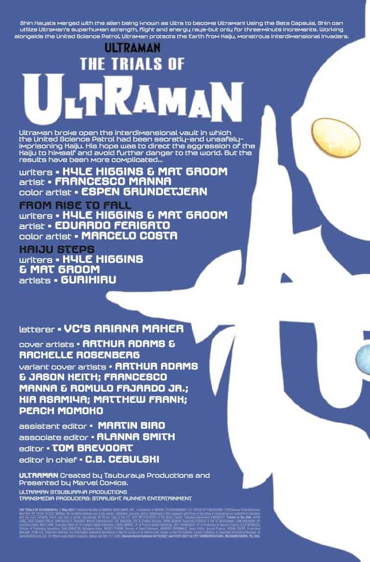 Ultraman narrowly averted a catastrophe decades in the making. The world was saved – but, also, forever changed. Now…come the consequences. Much of the populace regard their defenders with suspicion. Enemies hide in plain sight, and even those closest to Shin Hayata don’t necessarily have faith in the Giant of Light. But at last, a long-thought-lost comrade has mysteriously returned! That’s a good thing…right? The RISE is over. The training wheels are off, and the stakes have never been higher. THE TRIALS OF ULTRAMAN begin here!