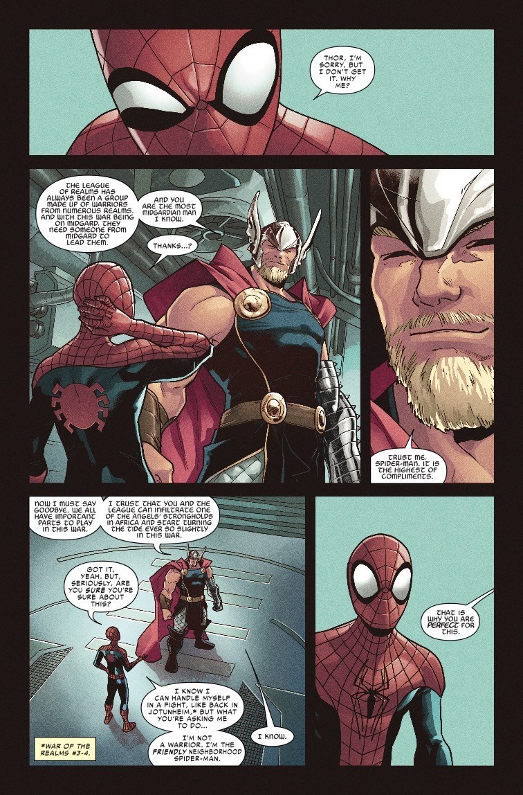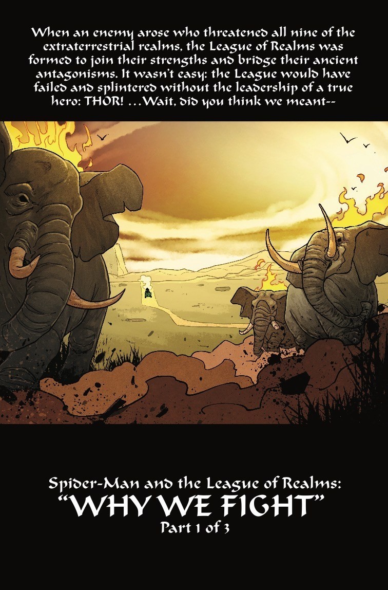 A WAR OF THE REALMS TIE-IN! In order to win the War of the Realms, we need a LEAGUE OF REALMS! Thor once led this team with one representive from each fantastical realm, but the League has a NEW leader and representative of Midgard- SPIDER-MAN!