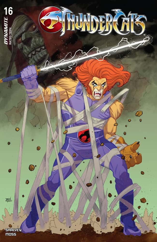 Tireless talents DECLAN SHALVEY and DREW MOSS pull out all the stops for the launch of their fourth story arc in ThunderCats #16 — heralded by celebratory coats of arms from MOSS, SHALVEY, LUCIO PARRILLO, JAE LEE & JUNE CHUNG, MANIX, and a special Teenage Mutant Ninja Turtles homage cover by KEN HAESER!