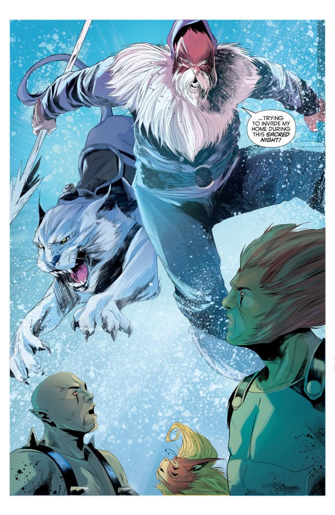 While on a mission in the snowy mountains of Third Earth, the ThunderCats stumble across Snowman, the last of his people, on the eve of the Festival of the Claw – a day of celebration, food, and gifts, and a time for Snowman to pay tribute to those he’s lost. With no others of his kind remaining to pass his traditions on to, Snowman shares them with the ‘Cats, who understand all too well the need to persevere in the face of overwhelming loss.