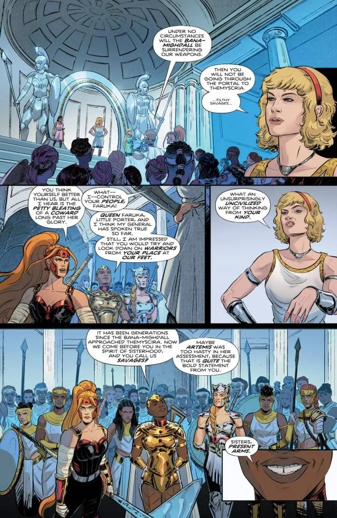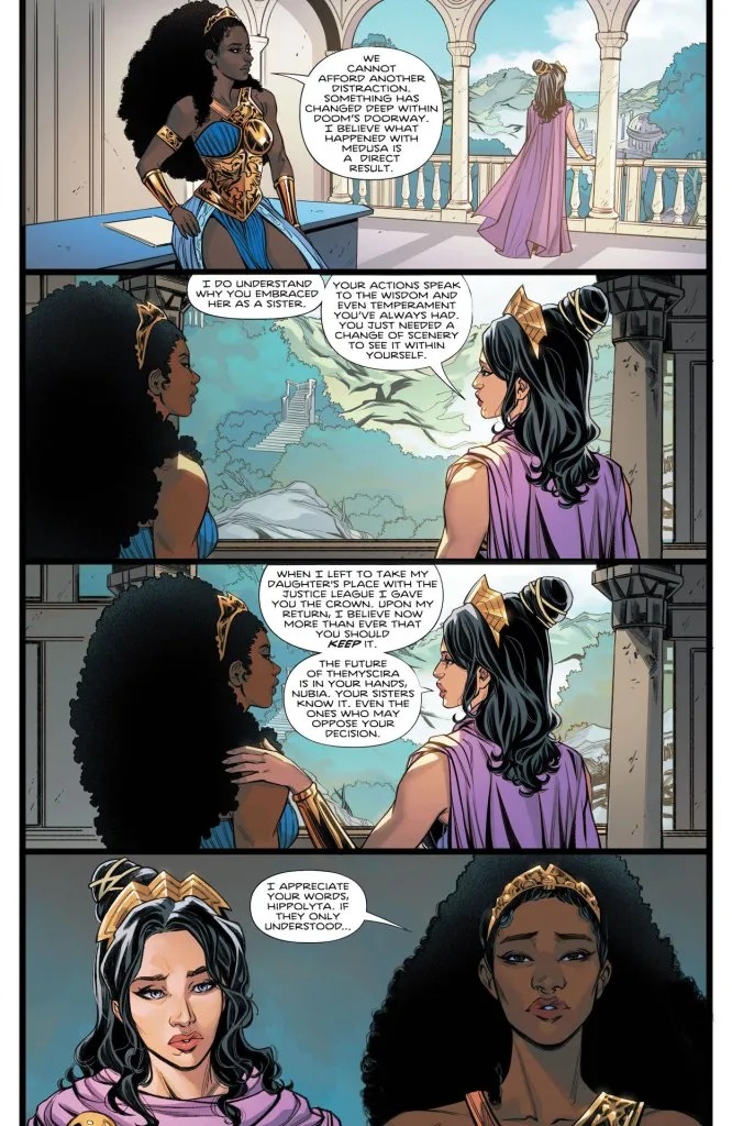After the events of Nubia & the Amazons, the dangers of Doom’s Doorway have found their way to Man’s World and garnered the attention of not one, but all three Amazonian tribes. The Bana-Mighdall consider it to be a weakness in the current regime and have decided to return to the shores of Themyscira to stake their claim over the island. Little do they know, the Esquecida are not far behind, but instead looking for help to combat the evil unleashed. Tempers rise and swords are brandished as the women argue about the best course of action. Now Queen Nubia must show them all the way to peace by calling for one of the most famous Amazon traditions…the Contest. Who among them is worthy of leading them into the future? Find out as the bravest, wisest, and fiercest warriors compete to be champion of all the Amazons!
