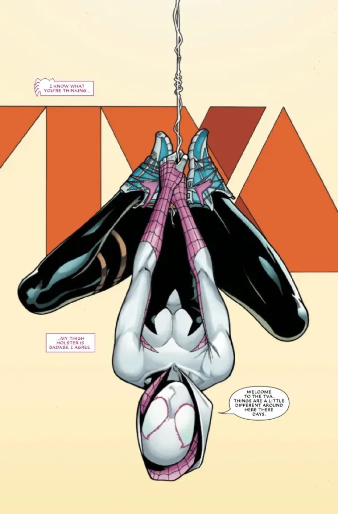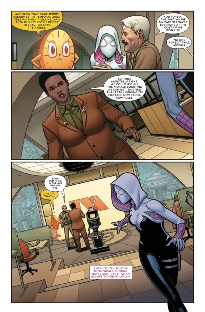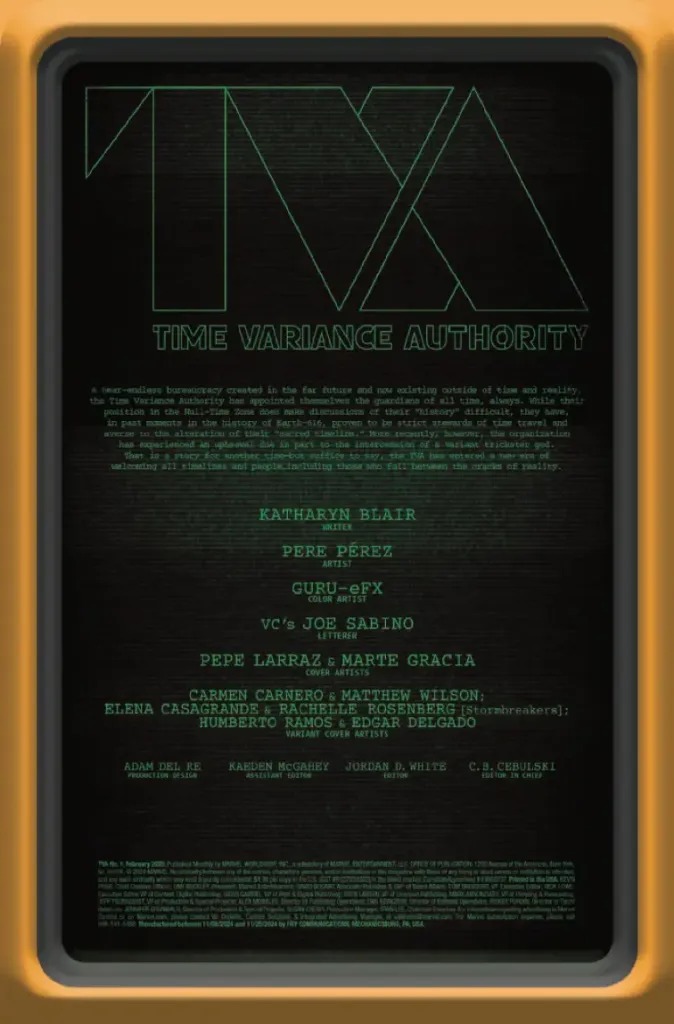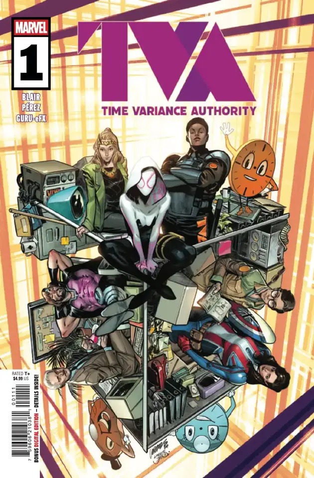 FOR ALL TIMES, ALWAYS! The Time Variance Authority has long watched over the timeline, protecting it from dangerous variations that could cause the end of EVERYTHING. Now, as the organization begins to expand its tolerance of variants, it’s enlisted some new recruits from timelines that have been wiped from existence: Captain Peggy Carter, Super-Soldier of her world; Gambit, despondent and aimless from the loss of his lady love; and… this can’t be right… Spider-Gwen?!? Has her world been destroyed?!? Writer Katharyn Blair (LOKI Season Two) and artist Pere Pérez (CARNAGE, SPIDER-WOMAN) bring a touch of cinematic flair to the bureaucracy at the end of time!