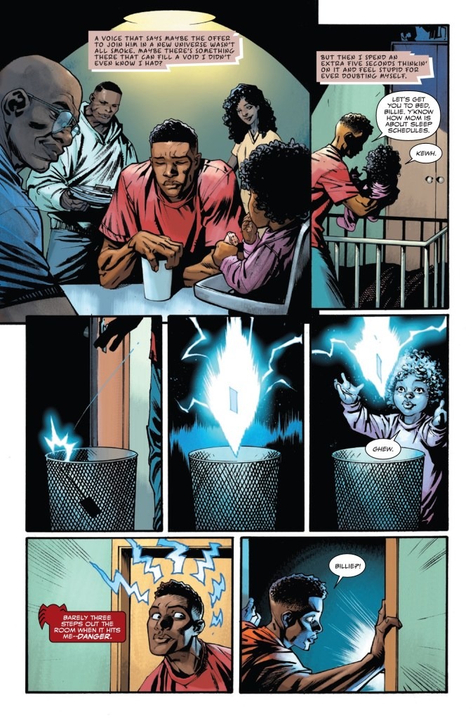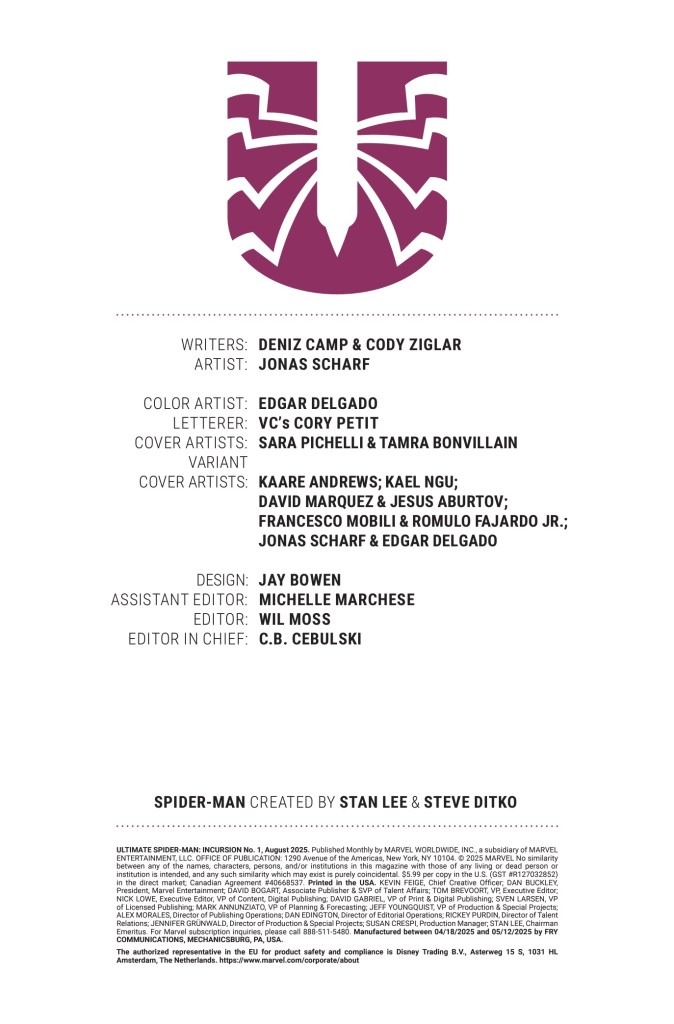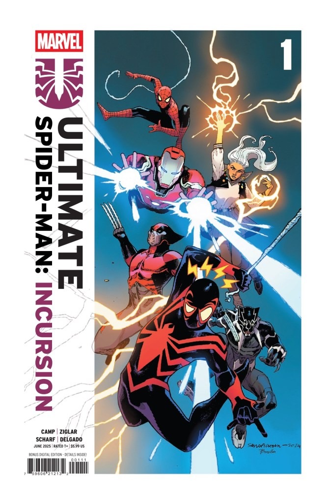 MILES MORALES CAUGHT IN THE MIDDLE OF A UNIVERSAL COLLISION! Two of today’s most exciting writers, DENIZ CAMP (ULTIMATES) and CODY ZIGLAR (MILES MORALES: SPIDER-MAN), join forces for an adventure that will change Miles Morales – and the Ultimate Universe – forever! Drawn by rising star JONAS SCHARF, the brilliantly moody artist who brought you ULTIMATE UNIVERSE: ONE YEAR IN and DARK X-MEN… Before the Maker remade Earth-6160, he left Miles Morales the key to reach his new universe…and when Miles’ baby sister, Billie, uses it to travel to the Ultimate Universe, it’s up to Spider-Man to save her! But the Ultimate Universe is never safe for any Spider-Man! When the Spot attacks, Miles will have to team up with an all-new Peter Parker – and that’s just the start of his journey across Earth-6160…
