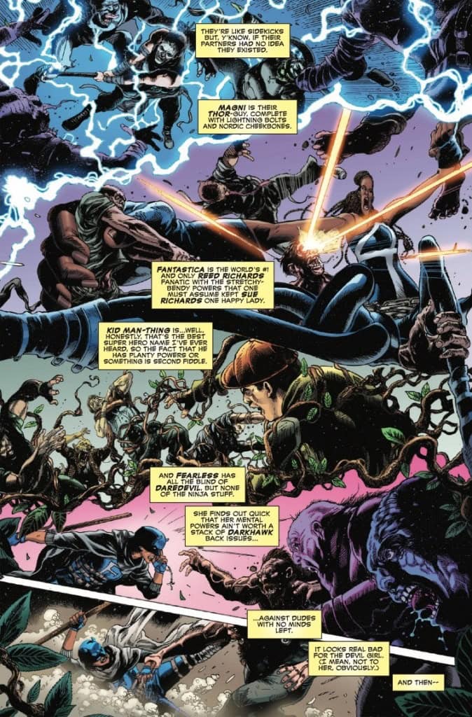 THE MERC WITH THE MUTATED MOUTH… HUNGERS! X YEARS LATER, and the virus ravaging the REVELATION TERRITORIES has finally made WADE WILSON into what he always wanted to be — a mutant! But not like this – NOT LIKE THIS! Deadpool’s healing factor is on overdrive, his mind a passenger in a body that hungers… and cannot be sated, unless he devours the life force of mutants! His next targets are the new blood known as FEARLESS, MAGNI, KID MAN-THING and FANTASTICA. It’s Deadpool like you’ve never seen him!