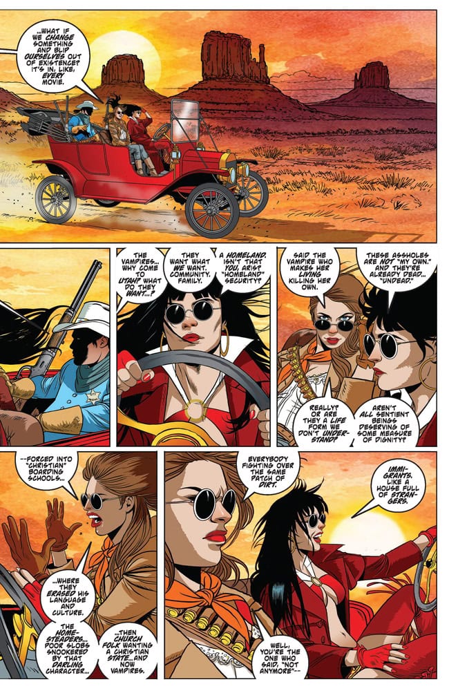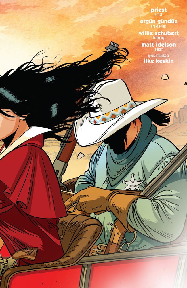 THE MAGNIFICENT VAMPI! Trapped in the 19th century Old West, the Daughter of Drakulon is faced with a stark choice: allow a rural town to be taken over by a deadly gang of blood-sucking lawmen, or use her own Vampiri abilities to save the town, and risk destroying her ability to return home through the resulting timestream interference! Grizzled comics gunslingers CHRISTOPHER PRIEST and ERGÜN GÜNDÜZ strap on their six-shooters for Vampirella #12 — flanked by cantankerous cover artists LUCIO PARRILLO, DERRICK CHEW, JOSEPH MICHAEL LINSNER, ELIAS CHATZOUDIS, and cosplay by RACHEL HOLLON!