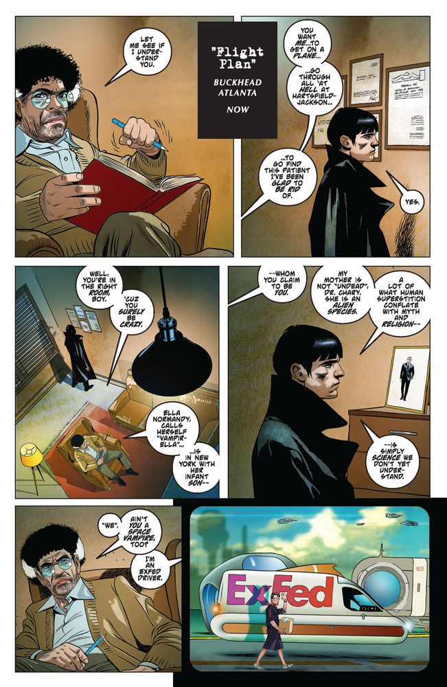 Meanwhile, Cicero — the mysterious stranger claiming to be her grown-up son somehow transported back through time — gives Vampirella’s therapist, Doc Chary, a glimpse of the dark future from which he has escaped. But will this knowledge help Chary’s spiraling patient — or send her even further down the pit of despair?