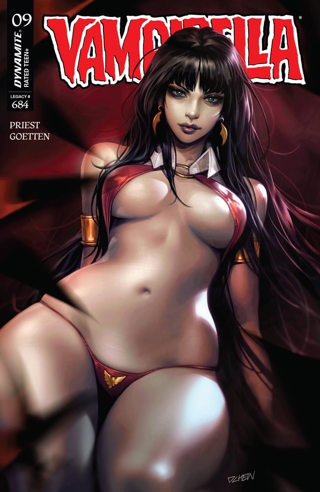 The answer will hopefully be found within CHRISTOPHER PRIEST and DAVIS GOETTEN’s Vampirella #9 — bolstered by perfectly imperfect covers from allegedly human artists LUCIO PARRILLO, DERRICK CHEW, JOSEPH MICHAEL LINSNER, ELIAS CHATZOUDIS, and cosplay by RACHEL HOLLON!