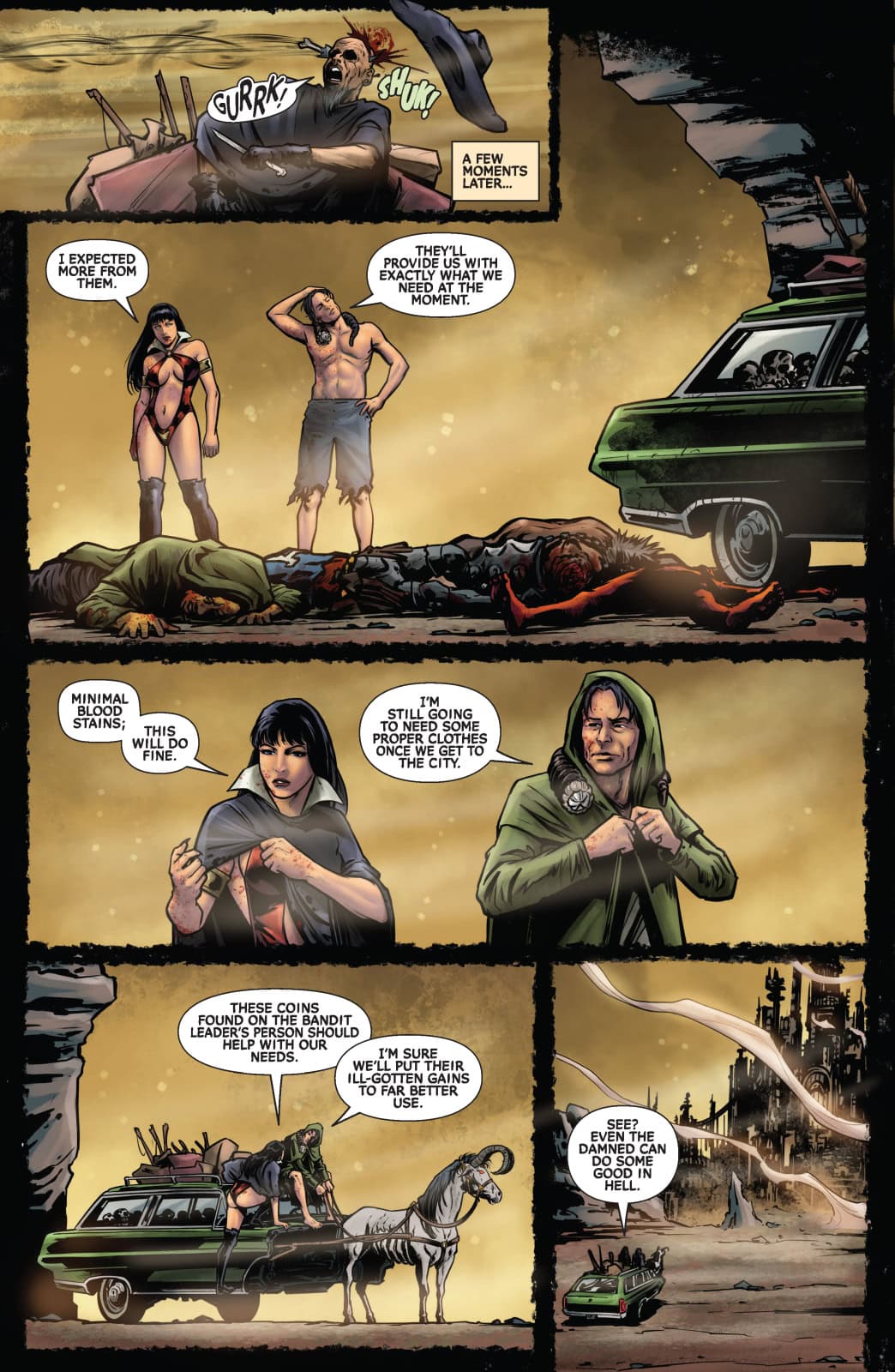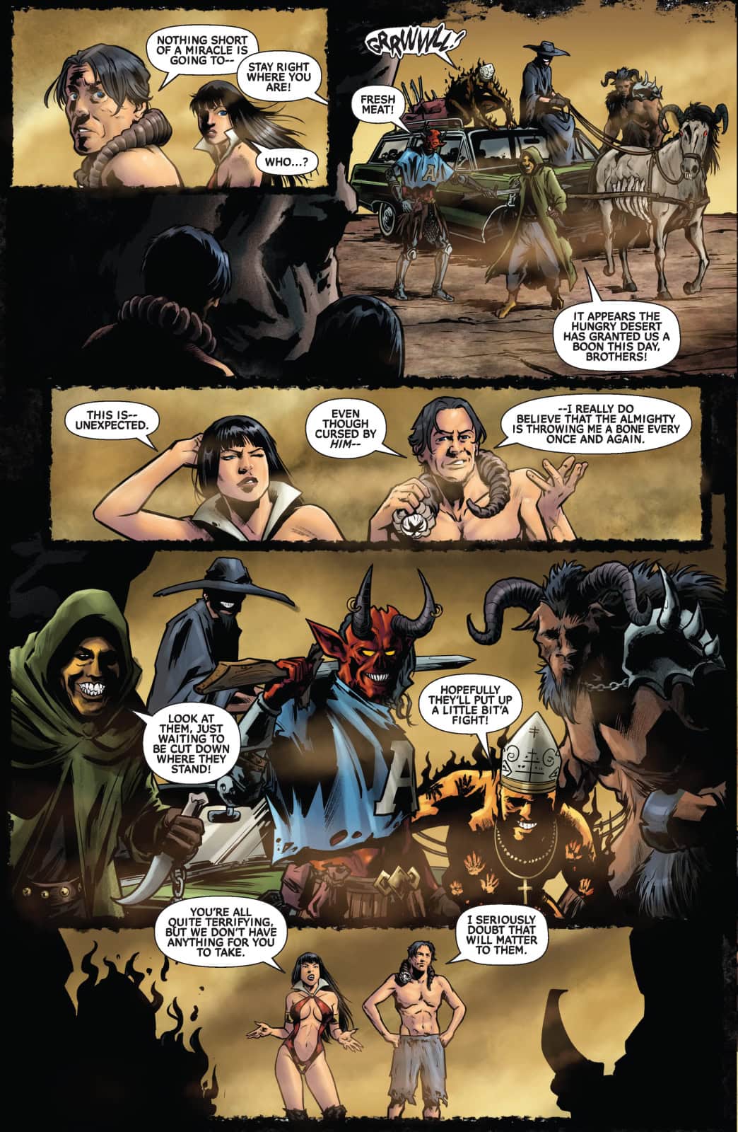 After enjoying a brief respite from the torments of the damned by holing up inside a giant worm (don’t ask…), Vampirella and Walker face off against the literal hordes of Hell when they’re caught between the warring factions of the Drujh and the Legions of the Shroud!