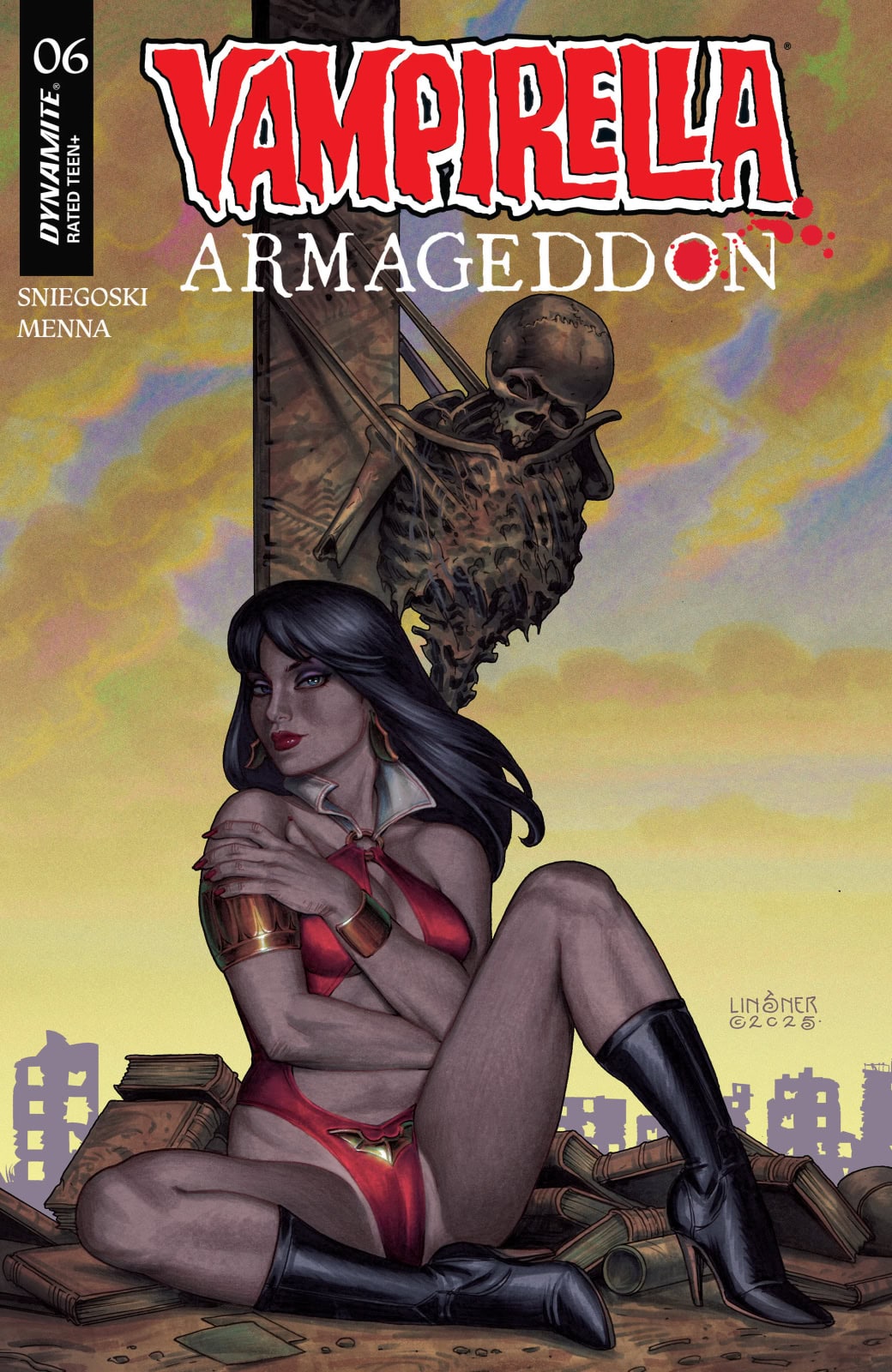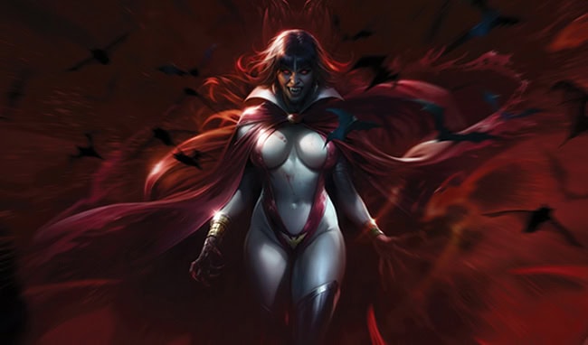 Veteran Vampi chronicler TOM SNIEGOSKI is joined by returning all-star artist EDU MENNA for the sixth issue of Vampirella: Armageddon — all clad in coruscating covers from FRANCESCO MATTINA, LESLEY “LEIRIX” LI, JOSEPH MICHAEL LINSNER, and fiery cosplay from IRELAND REID!