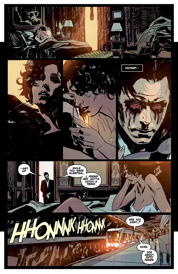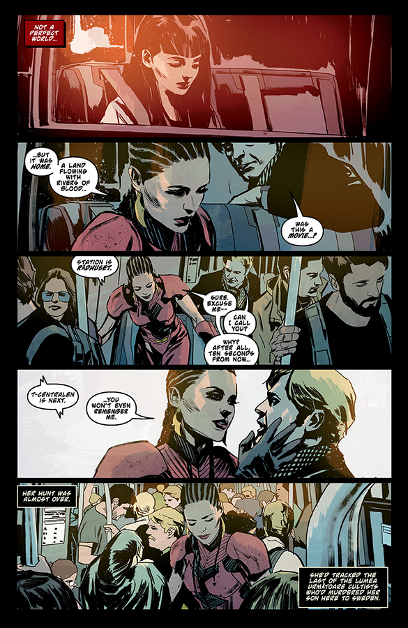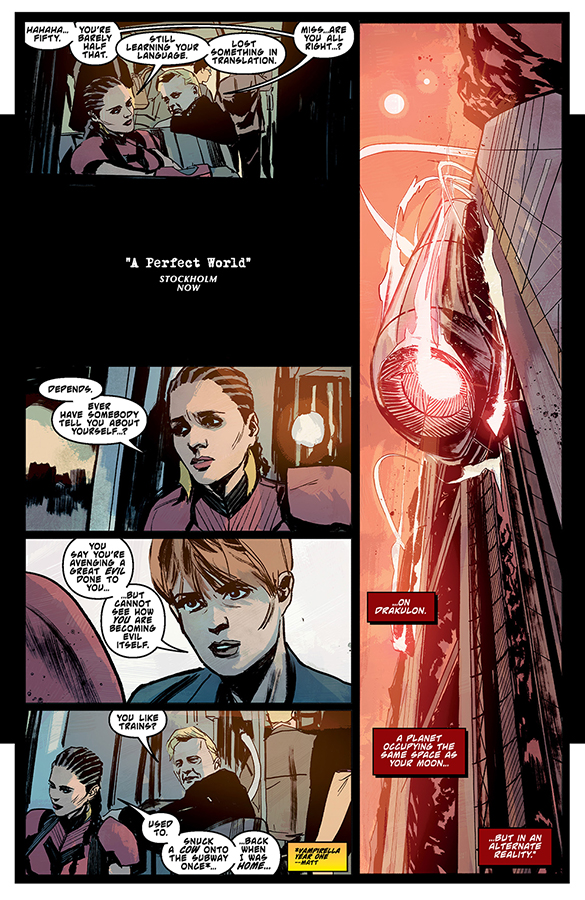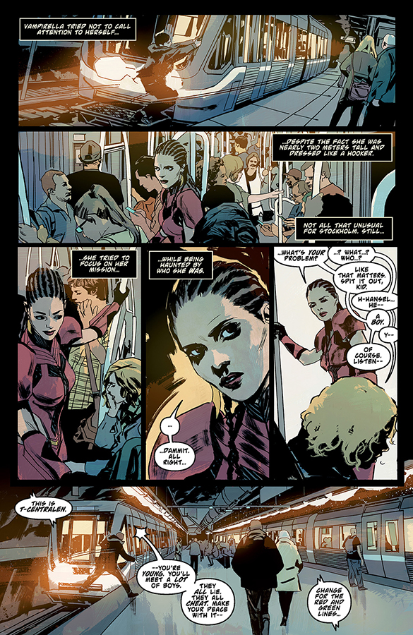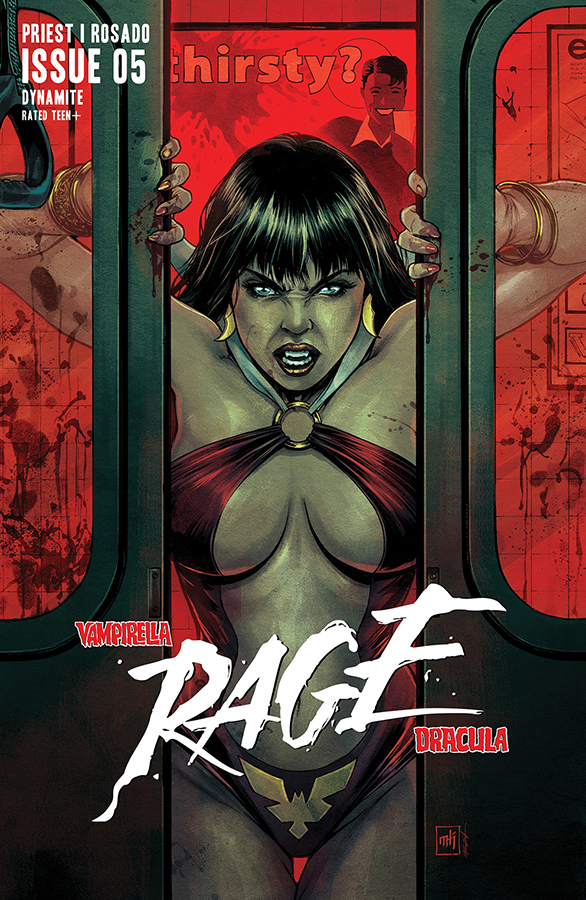 The only thing worse than being trapped on a packed subway train during a power outage is being trapped on a packed subway train during a power outage with a rage-obsessed vampire hunting you for the murder of her son. Will Vampirella endanger the lives of hundreds of innocents to achieve her vengeance — and, if so, can Dracula arrive in time to save her from herself?