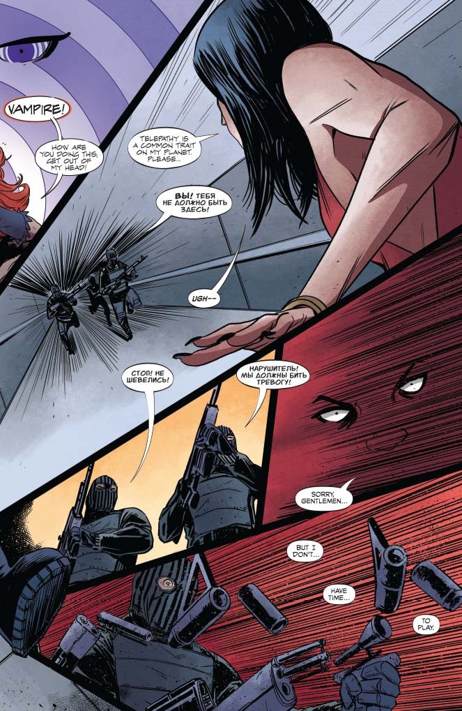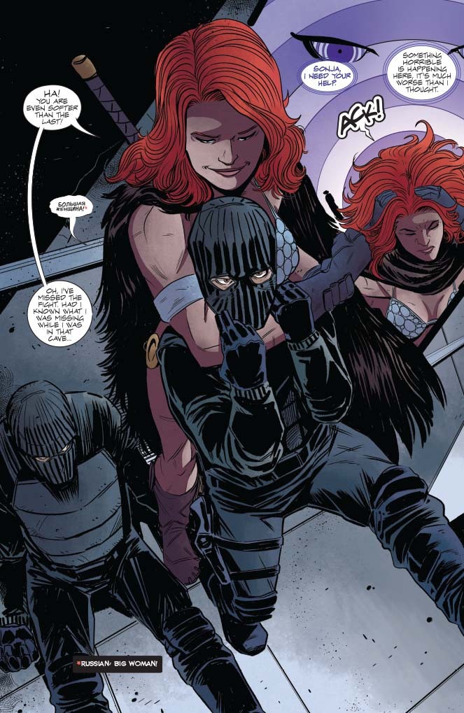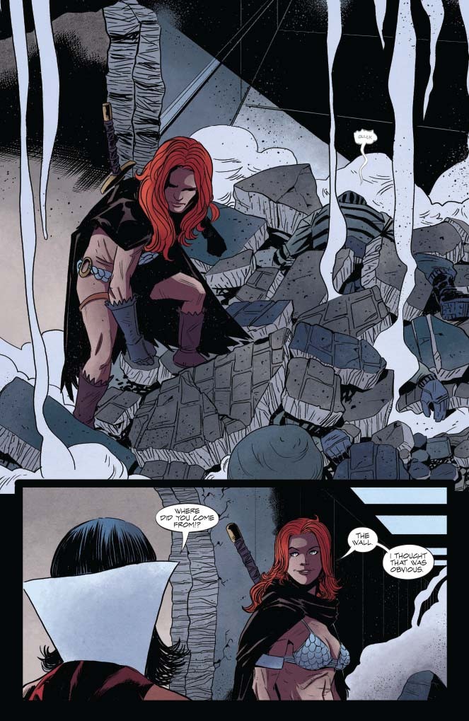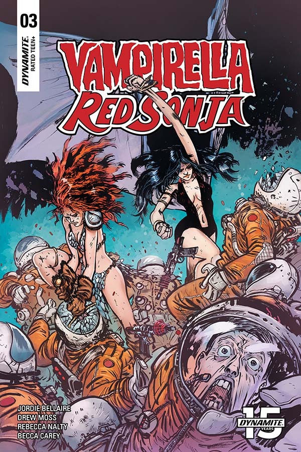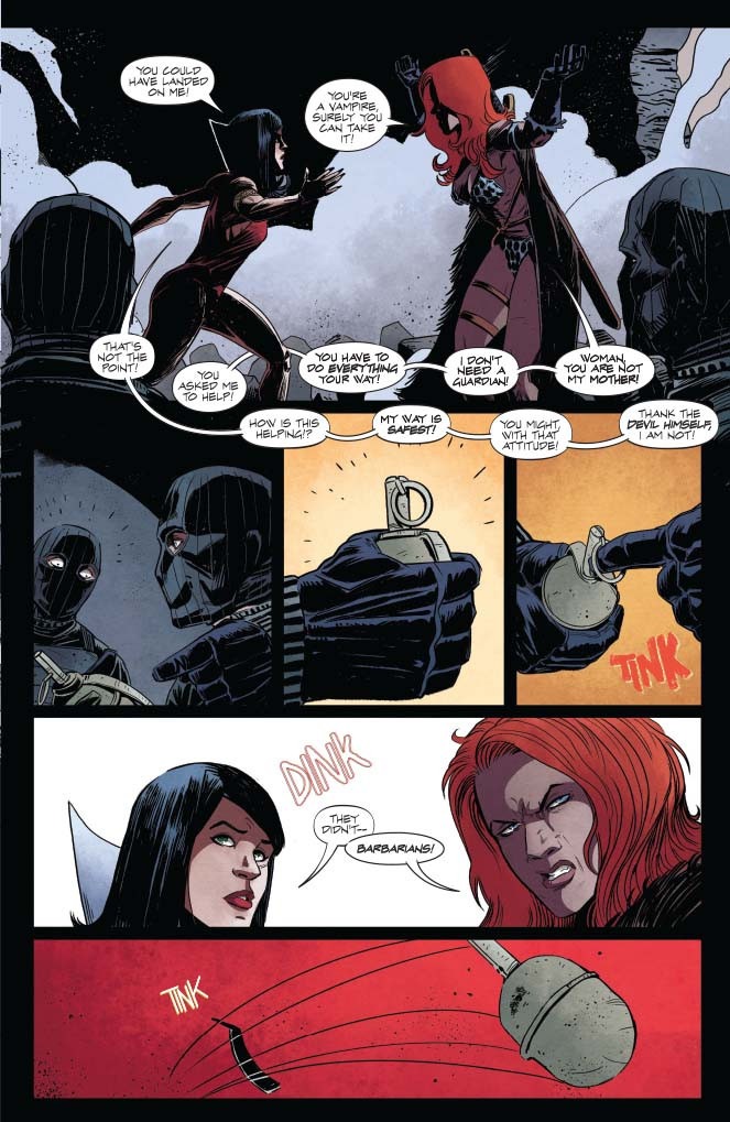 Hi! Here’s what’s going on: VAMPIRELLA found out some dudes’re doing experiments on vampires and she is piiiiiiiiiiised. RED SONJA is using this as an excuse to beat the holy hell outta a buncha soldier types. Many punches, many explosions, and somehow, at some point, Sonja punches through a wall. Find out how someone can punch through a wall, courtesy of JORDIE BELLAIRE (Buffy The Vampire Slayer) and DREW MOSS (Star Wars)!