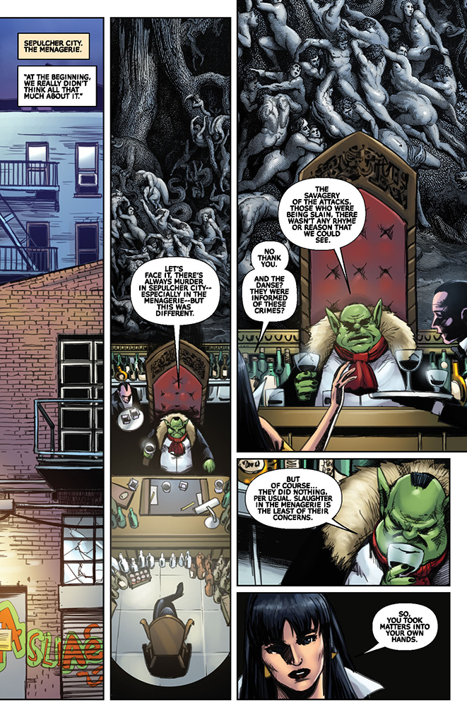 The murders in Sepulcher City continue and the streets of the Menagerie flow red with the blood of the innocent. Who is this savage killer and is it possible that he serves a master older than recorded history? Vampirella and the werewolf, Dagwood, are closing in on the mystery, and the killer is closing in on them. Enter the world of Vampirella Strikes under a series of amazing covers by returning superstars Lucio Parrillo, Stephen Segovia, Jonathan Lau, Junggeun Yoon, and another stunning cosplay cover — featuring Dizzymslizzyy as Vampirella!