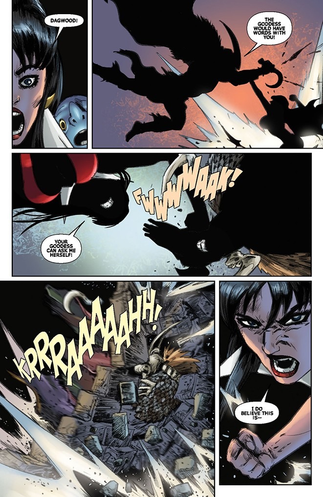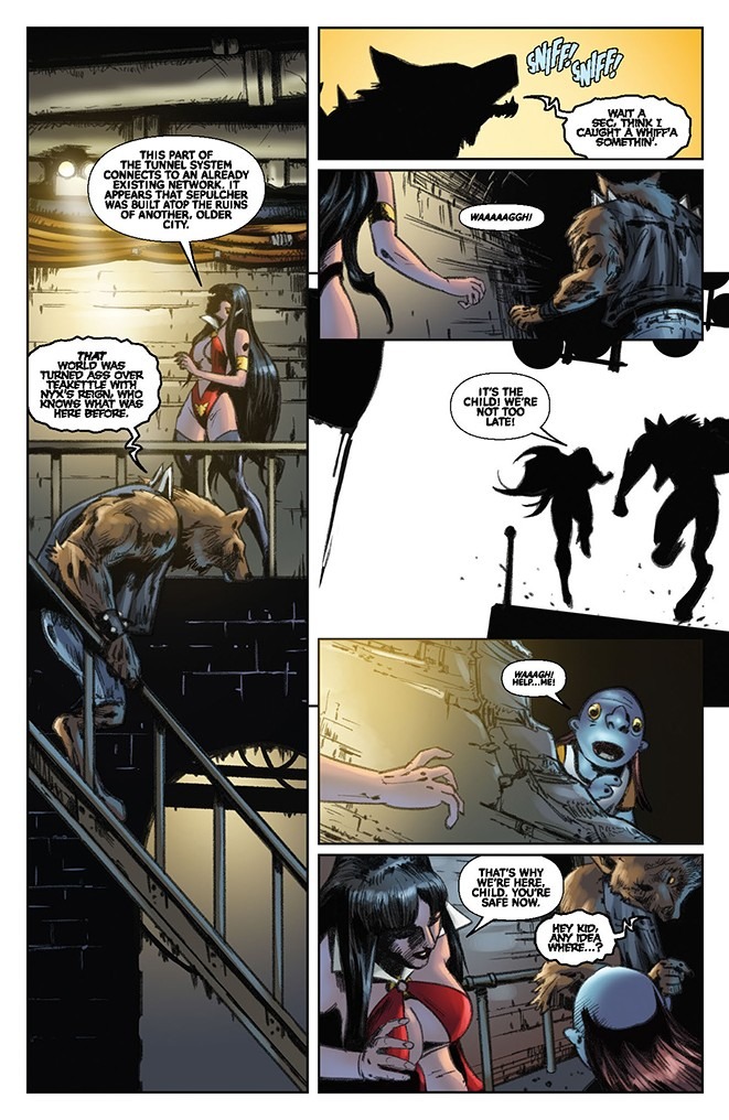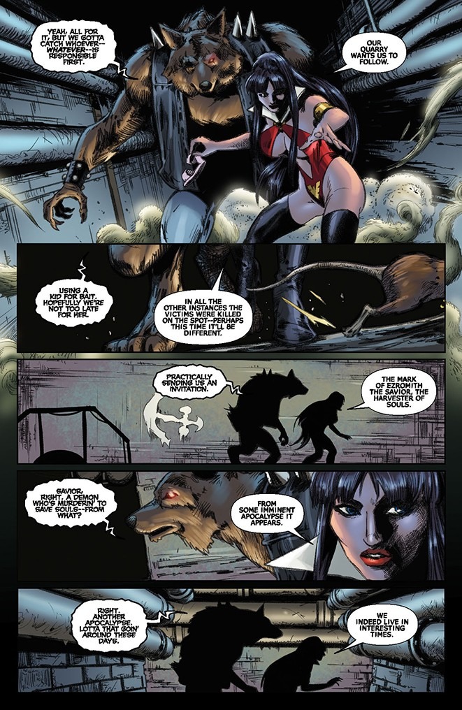 Deep beneath the streets of Sepulcher City an ancient goddess stirs. Vampirella and the werewolf, Dagwood, are on a mission to save an innocent child and confront a demonic deity with a forbidden knowledge of the future — a future where Vampirella herself is responsible for the end of the world!
