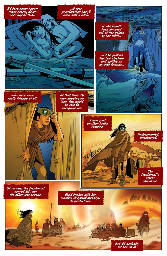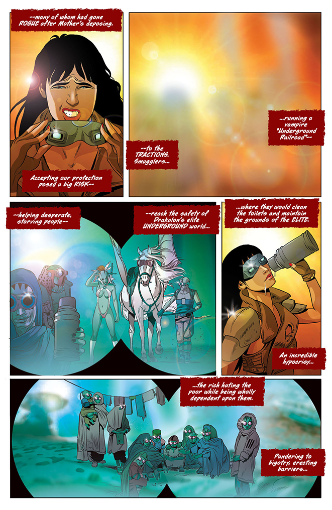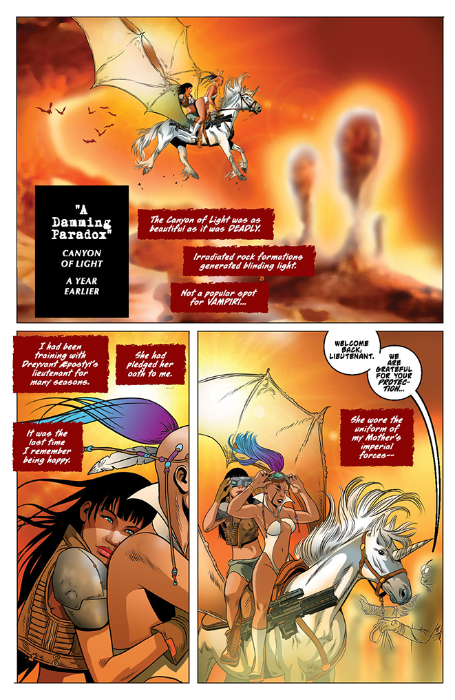 Lilith, the de-throned Black Queen of Drakulon, has vanished from the planet, and Dreyvant Aepostyl, her chief military general, is determined to have Vampirella ascend her mother’s throne in a ruthless coup attempt to retake power. But Vampirella has plans of her own, plans that are interrupted by an unexpected arrival: a human being from planet Earth!