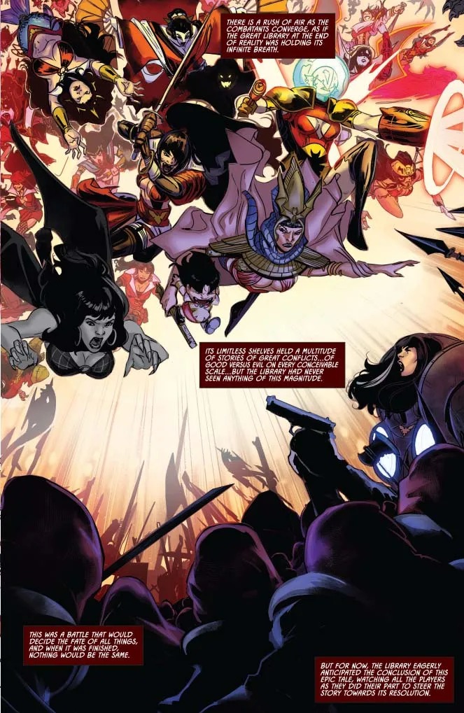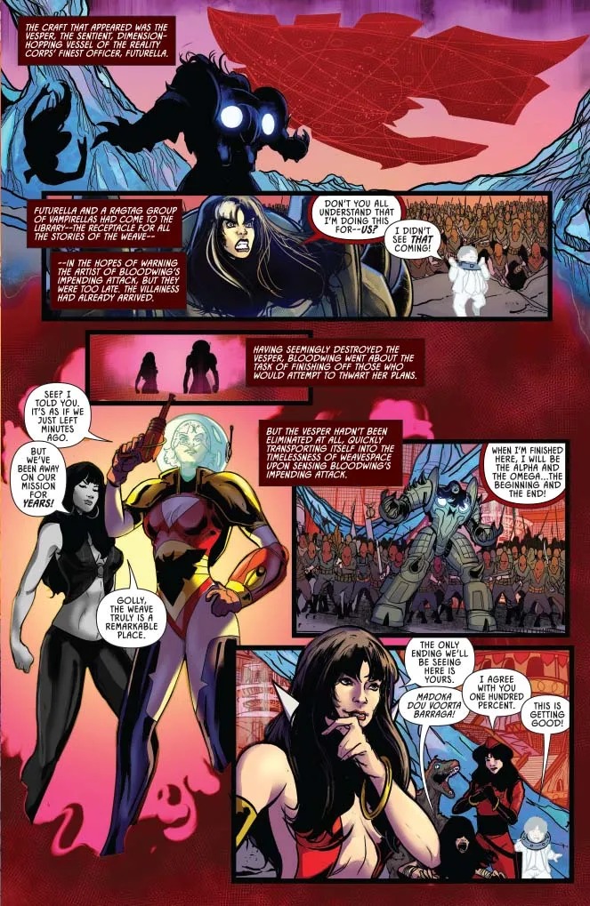 “In this issue, the evil Vampirella, Bloodwing, and her captive Book at last reach the fabled Library, the final stop before she can carry out her nefarious plan of destroying the Artist and rewriting all of the Vampirellas’ realities. But there are still major roadblocks: Book is missing the crucial pages that will lead them directly to the Artist, and an army of Vampirellas from realities far and wide hellbent on stopping her have just arrived at the Library. Will the daughters of Drakulon be able to defeat their psychotic sister and save the threads of the Fabric, or will Bloodwing vanquish them all and reshape their stories in her own glorious, twisted image?”