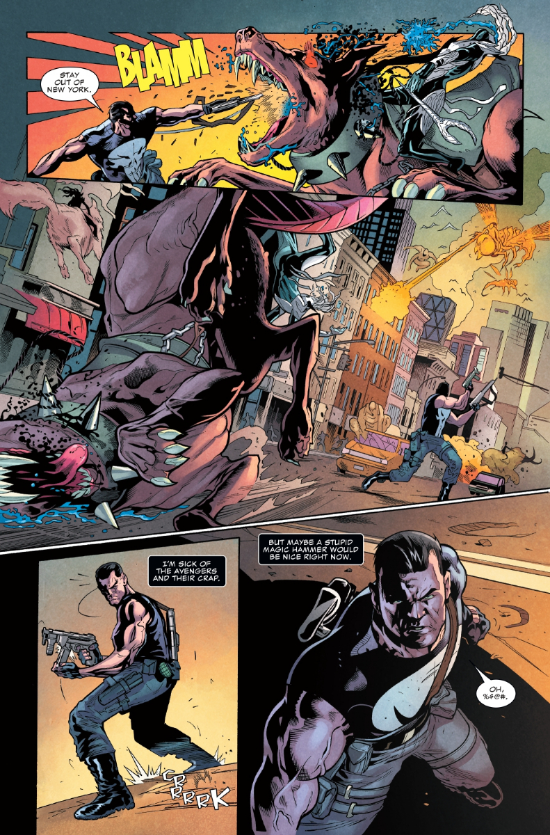 The War of The Realms has brought monsters to the streets of New York City, but New York has a monster all its own…Frank Castle, A.K.A. THE PUNISHER! And he’ll be damned to Hel if he’s going to let a bunch of Ten Realms tin-pot tyrants terrorize his town. But given he’s one man against an army of monsters, Hel might soon have him! The War of Realms is about to meet Marvel’s One Man Army. Expect Punishment!