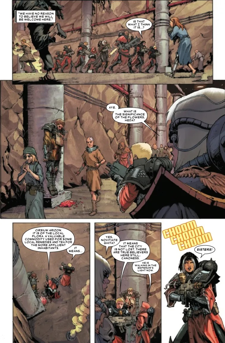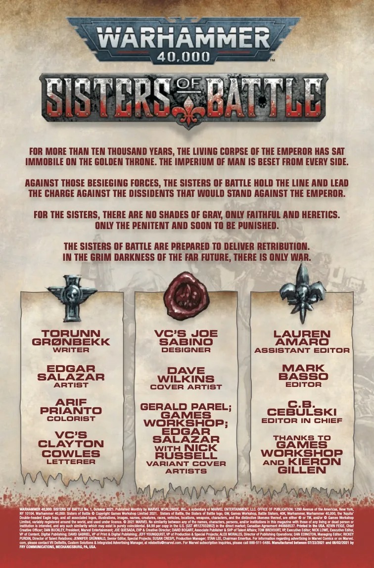 SURVIVE THE GRIM DARKNESS OF THE FUTURE WITH THE SISTERS OF BATTLE!A squad of Adepta Sororitas, led by CANONESS VERIDYAN arrive on planet Siscia to retrieve a lost Inquisitorial acolyte and put down a heretical uprising. As Novitiate GHITA’S first mission with her Order gets underway, what should be an easy mission turns into something much worse, as an unknown force deep within the subterranean city of the planet rears its ugly head! It’s no-holds-barred action, mystery, and daemons galore as the all-female military force lets bolters blaze and flamers scorch in this all-new saga! Show your faith and fervor to the Emperor by joining us for the start of the next phase of WARHAMMER comics at Marvel!