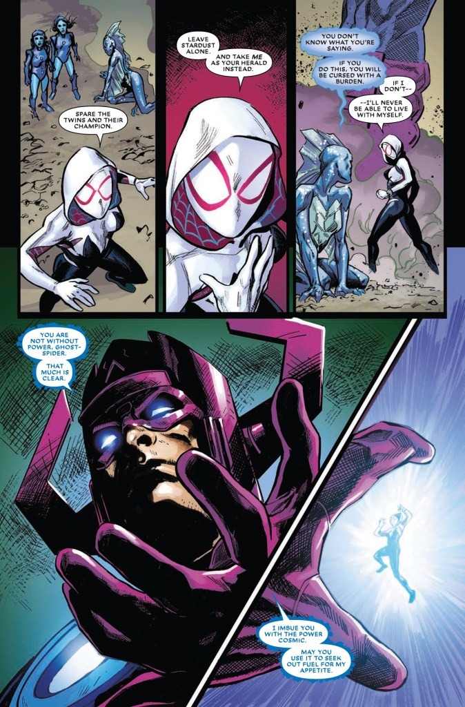 After coming to the aid of a wounded herald of Galactus, SPIDER-GWEN is empowered and enlisted in the service of the World-Devourer! But despite her new role surveying the galaxy, Gwen can’t help her heroic streak. So when she encounters a world reminiscent of her home, will she ally with its alien residents and attempt to battle one of the cosmos’ greatest forces?!