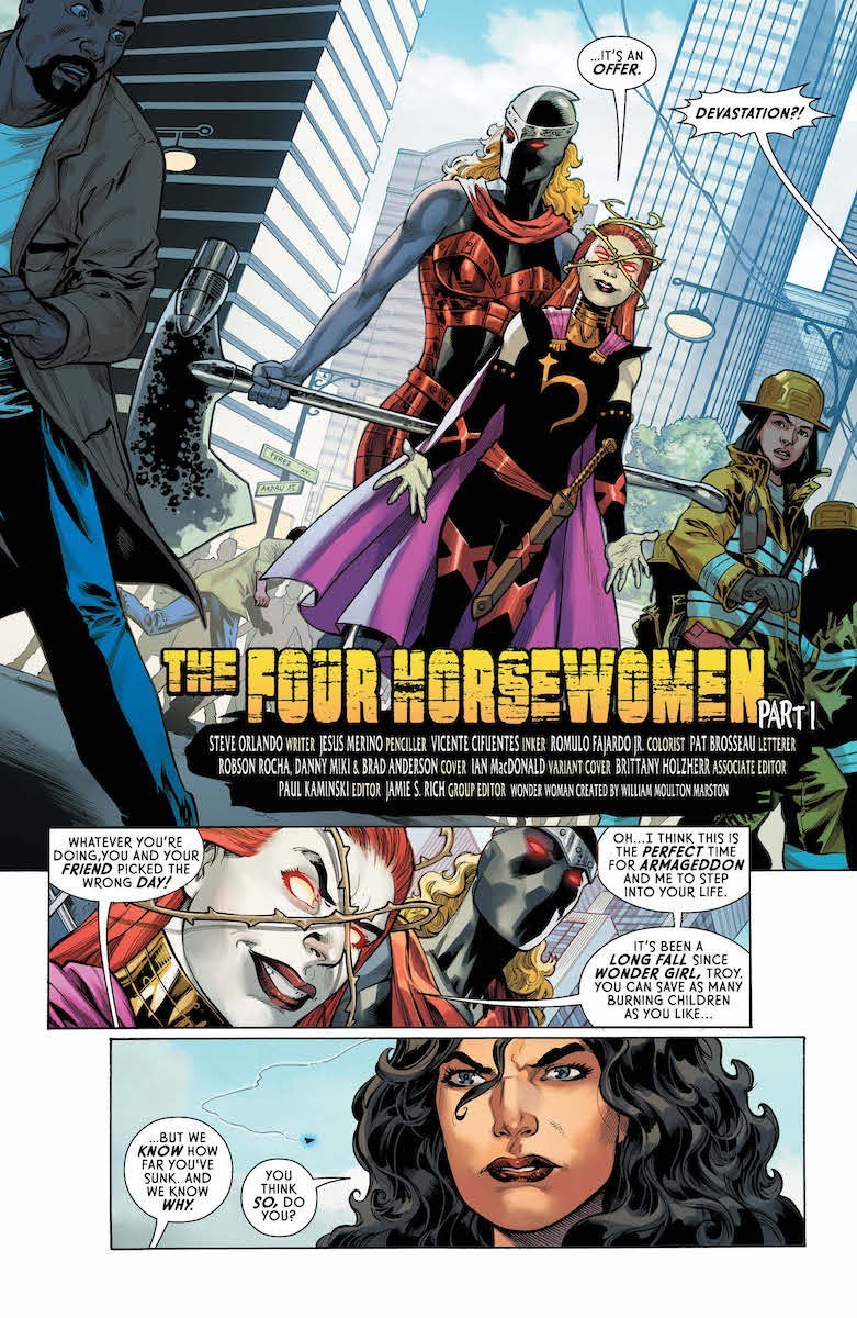 “The Four Horsewomen” part one! Paula Von Gunther, a.k.a. Warmaster, has assembled her four horsewomen…and now she’s out for Wonder Woman’s blood! Plus, Diana is put on trial for the sins of the Amazons! Is it all just lies, or is there really a horrible secret the Amazons have kept from their own champion?
