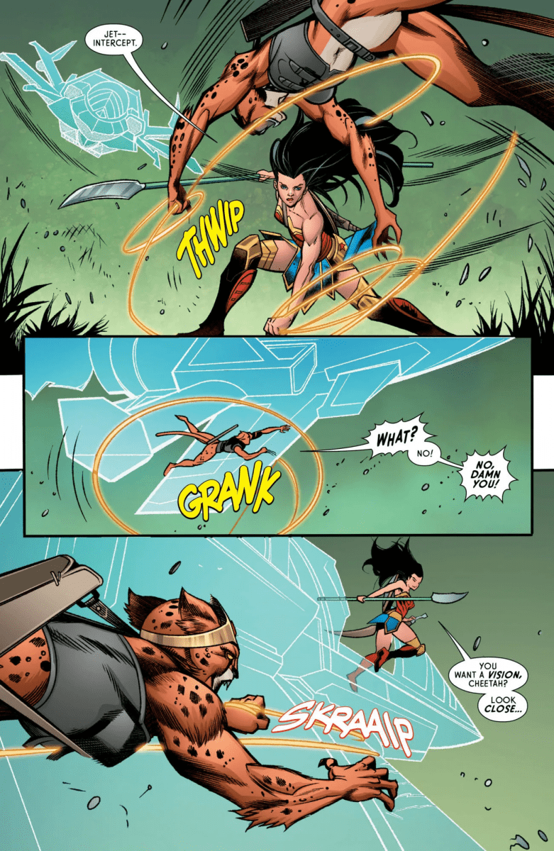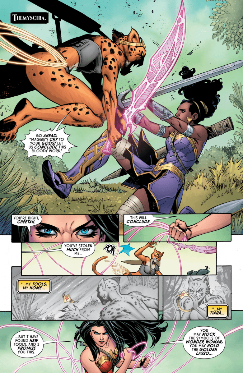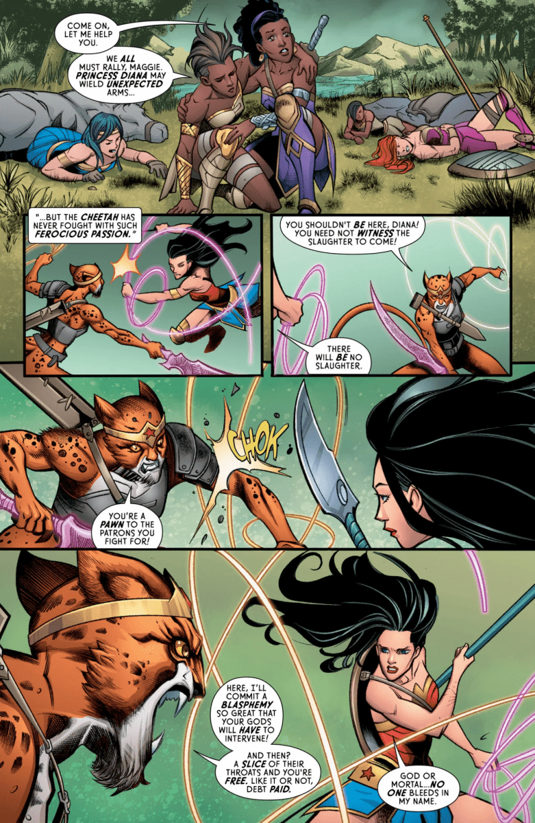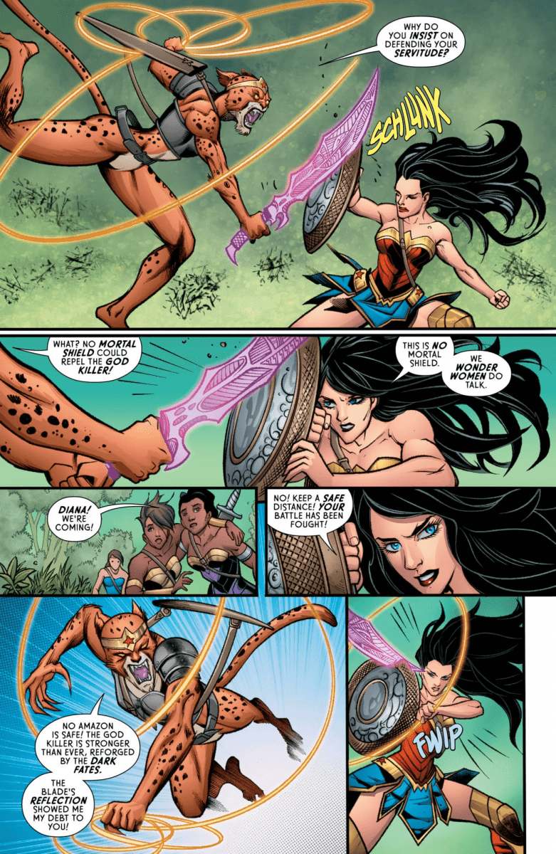 On the cusp of a new beginning, Wonder Woman must forge a fast alliance with a wild Amazon warrior from her past to halt The Cheetah’s malicious massacre! But long brewing tension turns Diana’s sister against her, giving the Cheetah her opening to place yet another God to the blade of her God Killer Sword. The kicker? The Cheetah thinks she’s helping Wonder Woman!