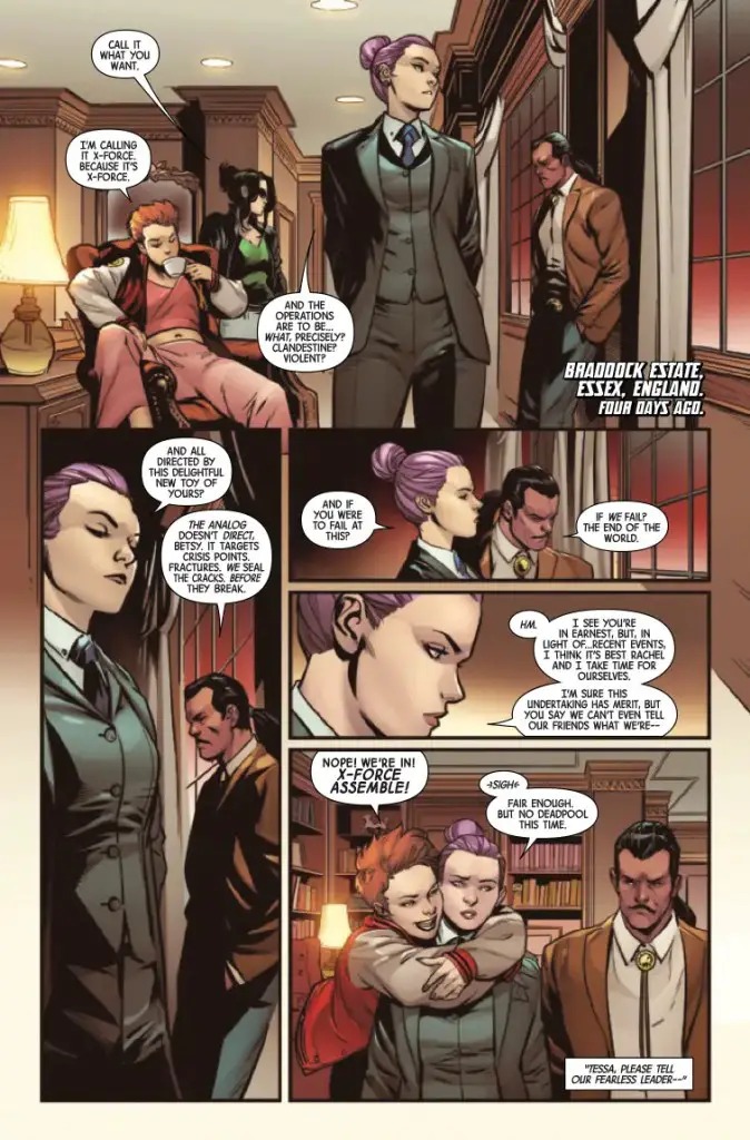 A NEW PATH FORGED! The world is fractured. FORGE uses his powers of invention to devise the only fix: an all-new, all-different X-FORCE! Forge leads a custom-made, handpicked team of mutants — RACHEL SUMMERS, BETSY BRADDOCK, SAGE, SURGE and introducing TANK — in off-the-books missions so dire, so integral to the fate of the Marvel Universe, there’s no time to stop for permission! As Forge detects increasing threats across the planet, he will recruit a specialist for each target — first up: that regenerating degenerate, DEADPOOL! Be here for an X-Force like you’ve never seen them before, stick around to see who joins, who lives, who dies and uncover the mystery of Forge’s discovery!