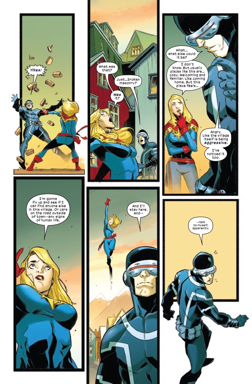 CAPTAIN MARVEL VS. CYCLOPS! Drawn to the Alaskan wilderness by magics neither of them understand, Captain Marvel and Cyclops duke it out! Agatha Harkness’ plan for the Darkhold is slowly taking shape…but will it come at the expense of two of the world’s greatest heroes?! And what can an energy-blasting mutant do against a woman who can absorb the energy of the sun?!