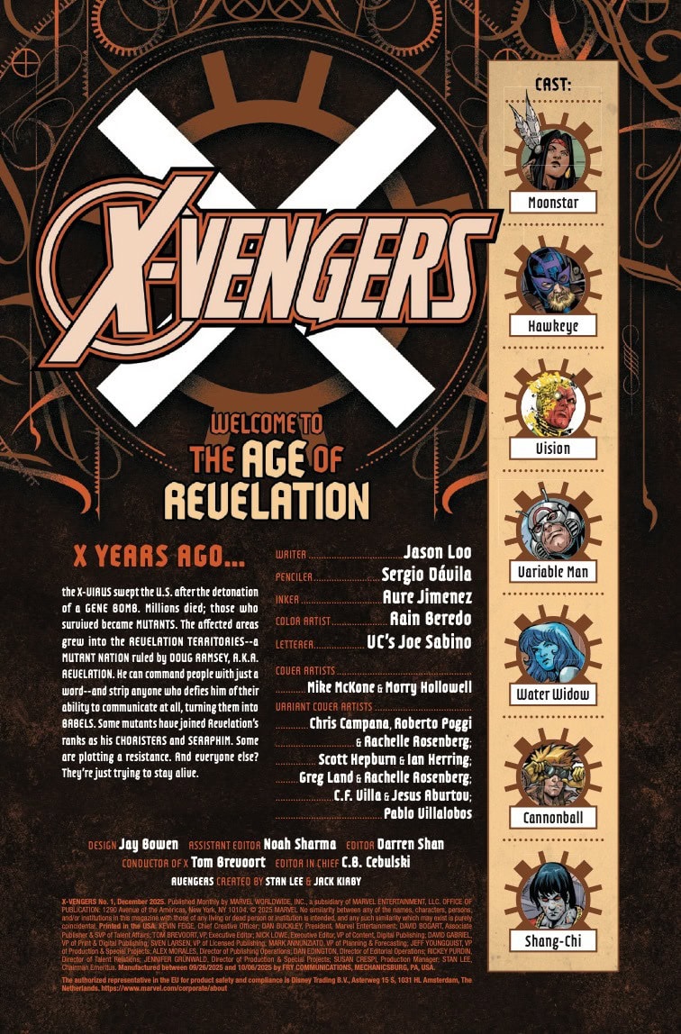 X YEARS LATER, Earth still needs the Avengers… but what happens when those who are left have transformed into mutants?! Dani Moonstar leads a new team of Avengers (Hawkeye, Vision, Water Widow, Shang-Chi, Variable Man and Cannonball) to protect the planet! But can these “X-Vengers” protect all of Earth, including the Revelation Territories?!