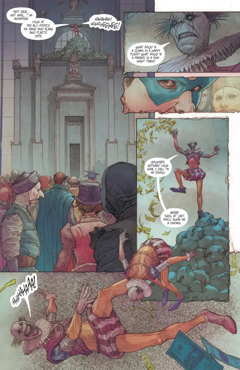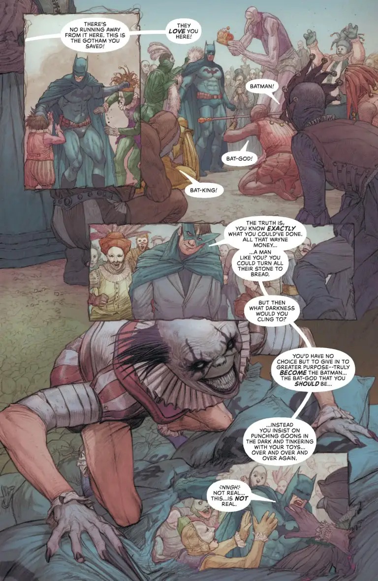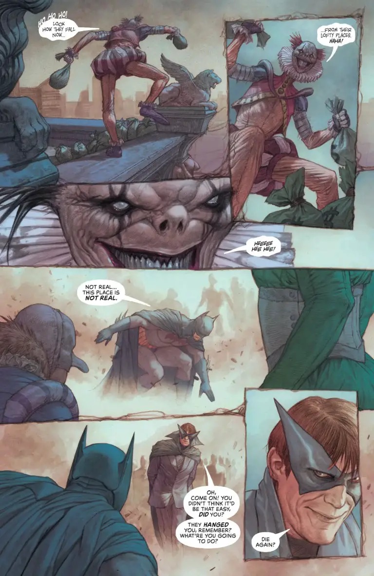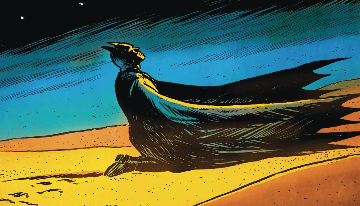 “Elegy of Sand” continues, and Batman’s hallucinatory trek across a desert between worlds becomes ever more dangerous as he finds himself face-to-face against…well, you’ll just have to wait and find out. Meanwhile, in Gotham, a strange Utopia is blooming as the Orghams continue to hypnotize the public into believing that Batman never existed. And as this knight-less city thrives, one must ask…did Gotham ever need Batman in the first place?