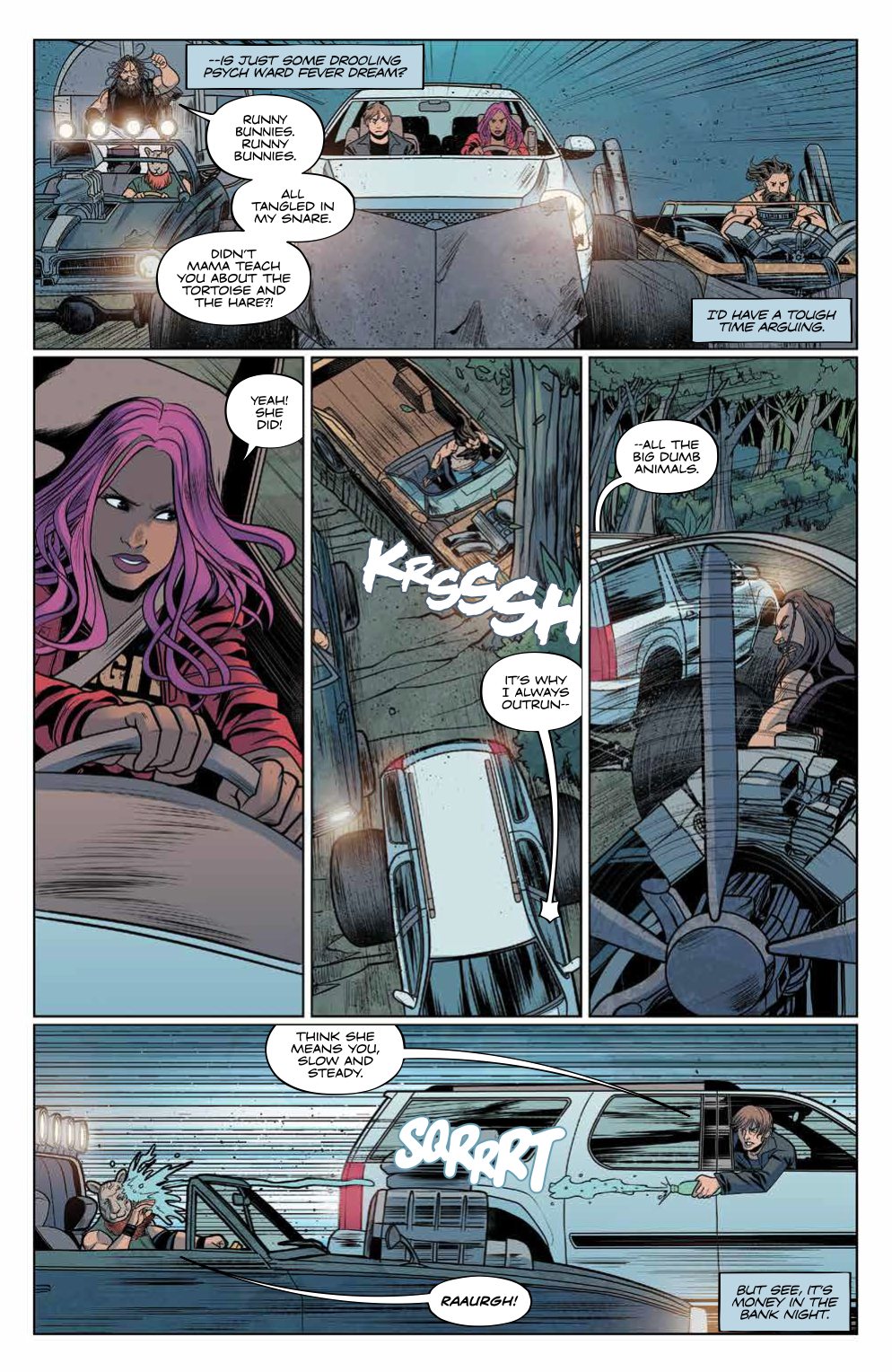 Boom! Studios latest comic book WWE #8 closes their Dean Ambrose arc in a surreal and highly enjoyable fashion, starting out with a bonkers car chase involving Ambrose, Sasha Banks, The Wyatt Family and Charlotte Flair and finishing up with Ambrose’s famous victory at Money in the Bank 2016.