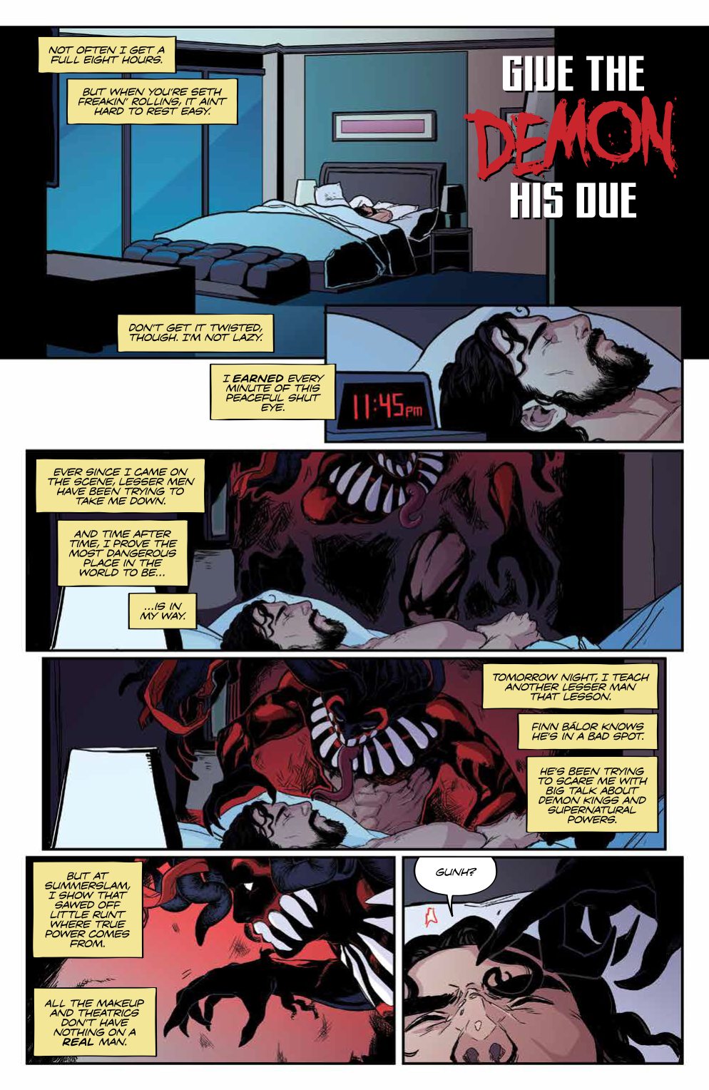 The main event of the comic is Giving the Demon His Due, a surprisingly small piece about the build-up to last year’s inaugural Universal Title match between Finn Balor and Seth Rollins. Writer Aaron Gillespie decides here to focus on Seth’s preparation for the match as the overly confident heel. Seth is being plagued with visions of Balor in his sleep and in the locker room before the bout and struggles to focus on how he is going to walk away the Universal Champion. Unfortunately, the strip decides to just focus on this and gives us no real in-ring action, which kind of leaves the whole thing feeling a little anti-climactic. The build up stuff is good and works as a nice addition to Balor’s character (especially considering how wasted he is on TV right now) but the payoff feels pretty weak.