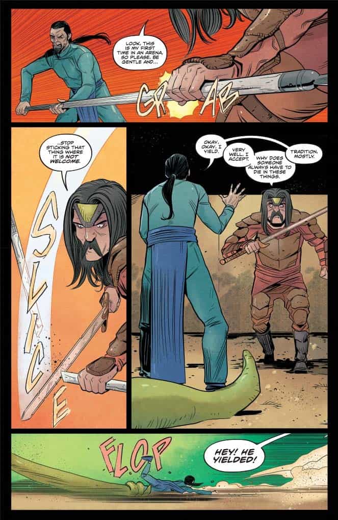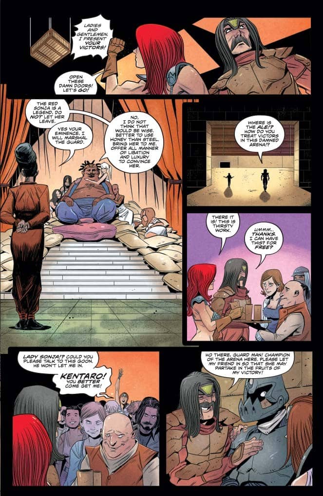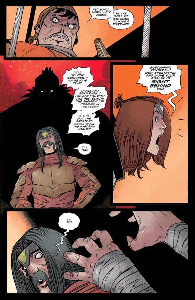 “Ten years have passed. Sonja is uninterested in battle…she’d rather eat meat and drink ale. But The Red’s hand will be forced, and she will answer the call to battle.”