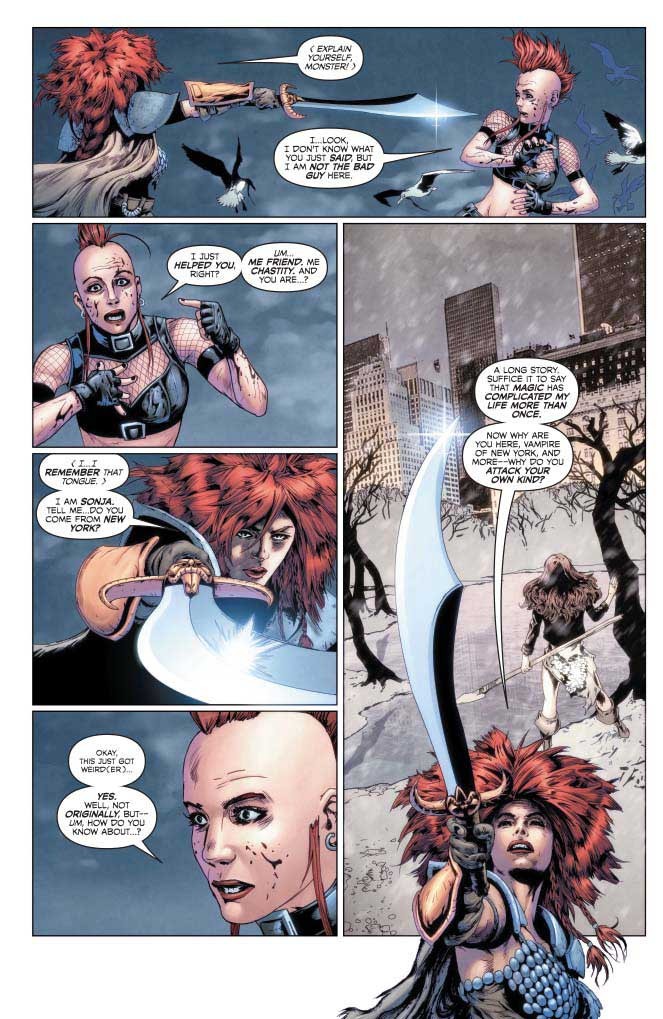 Red Sonja is fully made to understand that her victory over Kulan Gath not only led to the invasion of her world by a whole new kind of evil. but may cause time itself to end… much to the delight of the goddess of death, Mistress Hel. Only Sonja can set things right — but what she needs to do so will cost her a bargain with Lady Demon, as well as a personal quest her ego doesn’t want to accept. Thankfully she has backup in the form of the half-vampire, Chastity — and a good thing, too. To fix the path of fate, Sonja will need all the help she can get! The AGE OF CHAOS continues here!